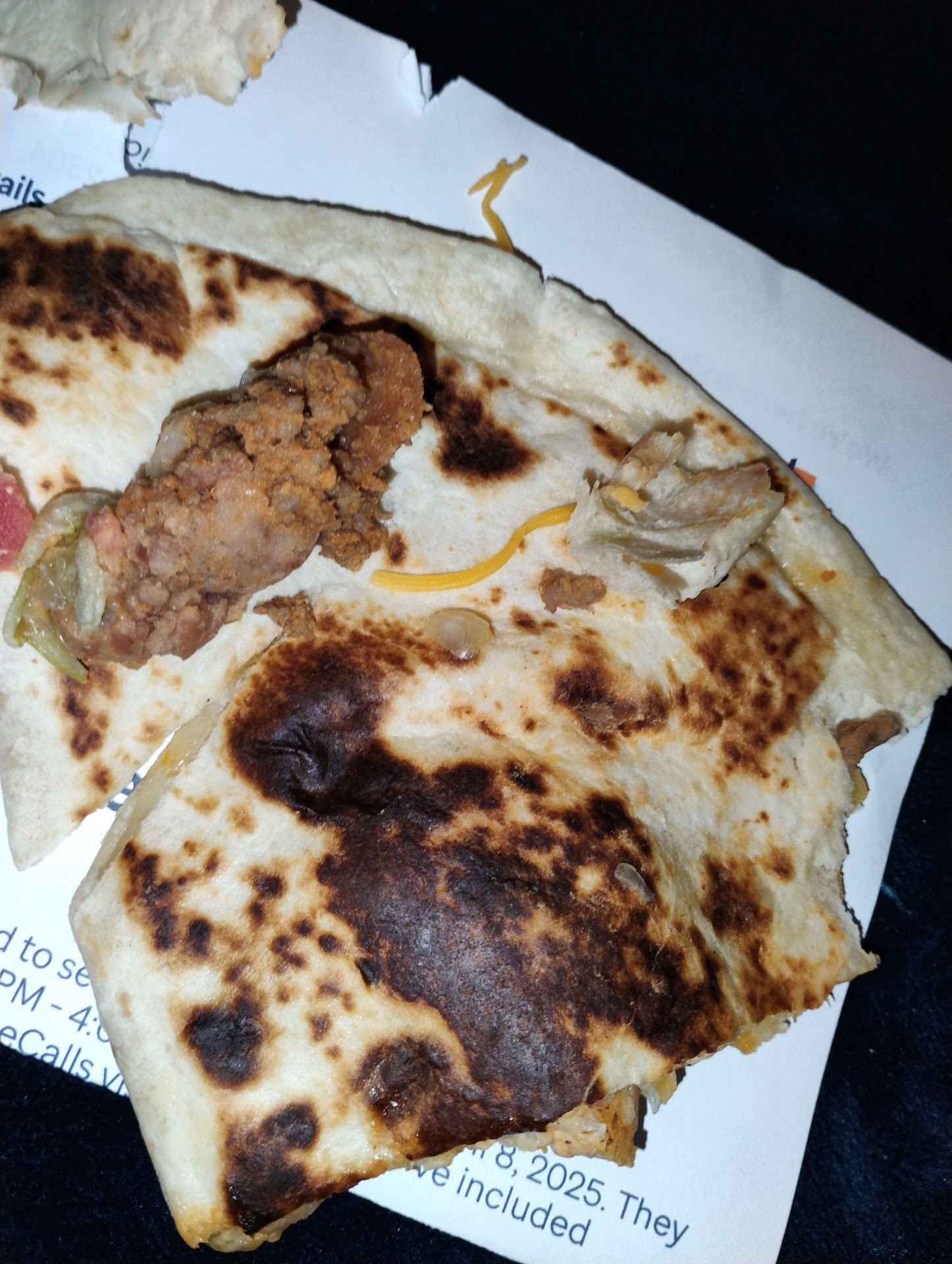 Read moreIf zero stars was an option I’d use it. I’m almost sorry to say this was the worst Taco Bell I’ve ever been to. First thing, the large table near the counter is ridiculously sticky, like someone dumped a Baja blast on the table and massaged it into the wood. Second, the food, I know Taco Bell is no gourmet establishment but if I order a steak quesadilla with easy cheese I still expected to have cheese in my quesadilla. I was severely disappointed when I took a bite and not only had no cheese, but also no steak. Half of my quesadilla was flat and empty. And on top of that, they didn’t have any Baja blast freeze. Then when I asked for a refund for my drinks, I paid cash, they said they could not refund my cash payment but the one good thing I guess is they allowed me to choose other menu items to substitute them. Then I proceeded to wait 15+ minutes for the same quality of food I’d received moments ago. Mediocre food. Subpar service....