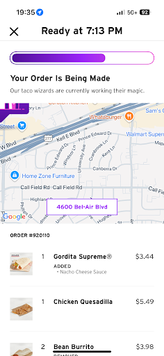 Read moreIts Taco Bell, if you've ever been to one you know what to expect. If you haven't its like Americanized mexican food. This particular one has always done well with my orders. I get all the right items just the way I ordered them.