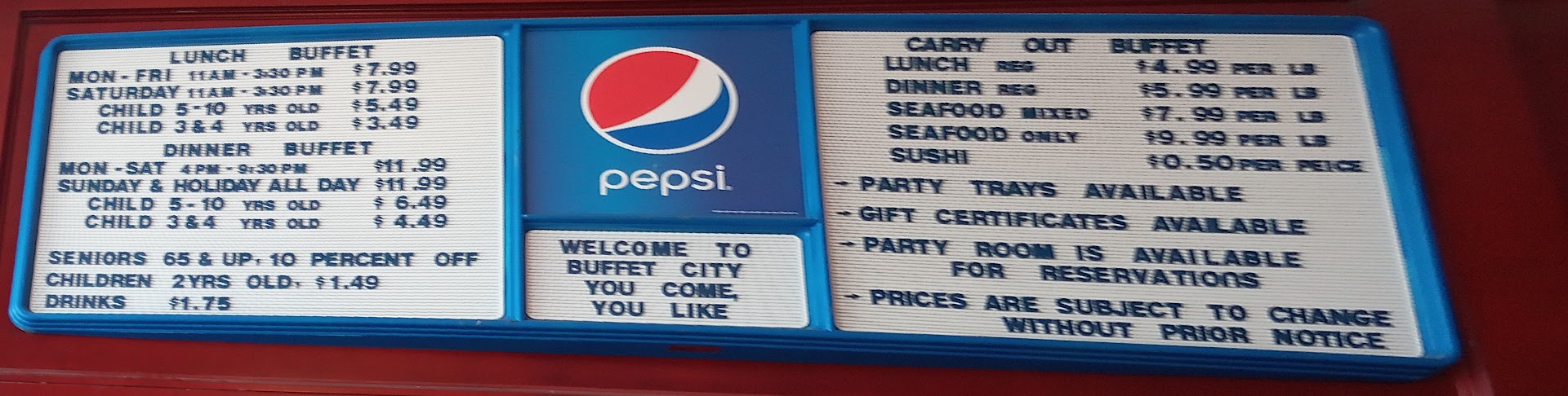 My husband and I stopped here over the weekend. I was a bit worried when I seen the sad fish tank that only had fish with no decor but I thought let's try it anyways. The hostess was very kind and immediately asked about the bandage on my forehead. We were seated quickly and our waitress was very quick to bring our drinks. When I enjoy a buffet, I prefer to have small portions of a little bit of everything and I don't like my food to mix. I don't overfill my plate. I choose lo mein, mushrooms, coconut shrimp, and crab delight. Everything was hot and fresh. My second plate was black pepper chicken, honey chicken, more mushrooms, crab ragoon, steamed dumpling, and rice noodles. The crab ragoon needs more crab but it was fresh. I had a little issue with the dumpling and I pointed it out to the waitress. Immediately the hotess or manager came over and apologized for the inconvenience. And she addressed the situation quickly. All this time I'm watching our waitress. She was fast at clearing, cleaning, and serving her customers. I went back for one more plate but this time it was a generous portion of the Absolutely Delicious Mushrooms!! The jalapeño that had been added were just the Perfect kick!! The interior was clean but could definitely use a refresh and maybe a little more light at each booth. The booth itself was loose so when anyone sat behind me and moved so did I, that was a little annoying. I'm giving Buffet City 5 stars because the food was fresh and delicious and the staff was friendly, kind, and fast. The price is comparable to other Chinese buffets, about 20$ per person with a buffet and soda beverage. We will...