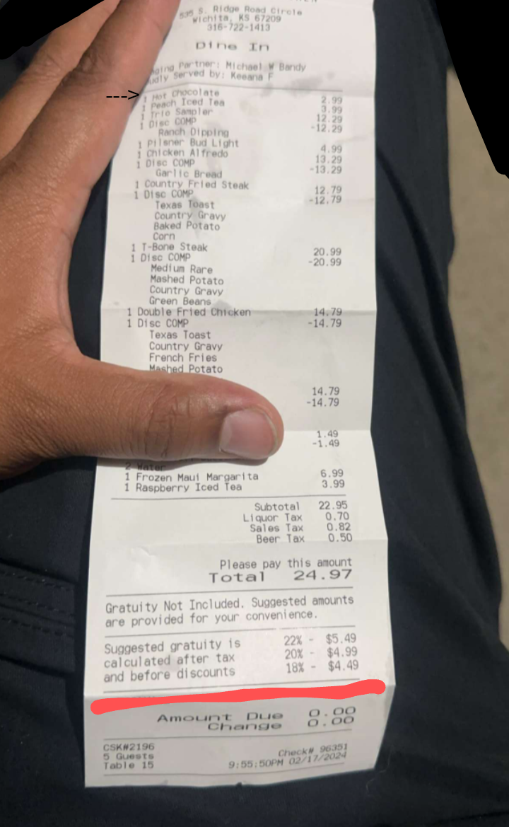 Read moreFlew into Wichita, and stopped here before went to my hotel. It was just me eating. Had a 30 minute wait after was told 15 minutes, which wasn’t a huge deal, it was a Sunday afternoon. I get seated however, waitress, Kaden (and only reason why I know her name is I asked the manager who was speaking to another table who I believe was not happy with service as well) She did not introduce herself nor had a name tag on) was standing right in front of me talking to another paying customer, so she saw me sit down. However, proceeded on with a 15 minute conversation about her future goals with this customer, thats fine if he was the only one in here but it wasn’t. I waited, and finally, I said, “Excuse me, is there another waitress in this section?” She looked at me and said, “Oh sorry!” Then turned and spoke to the customer for about another minute or two then came to me. She said, “Im so sorry about that. “ Okay fine, can give benefit of doubt, some people feel rude pulling themselves away from a conversation, but, girl you’re working. I order, she comes back 5 minutes later with a croissant, did not bring my diet coke that I ordered or a water and went right back into the conversation with the man sitting at the table in front of me.. 10 mins pass, had to interrupt her again, and ask for my drink, brings it out, goes right back to his table. Ridiculous, there were other customers she was neglecting as well. Food was good, why gsve it 3 starts, but Kaden, honey, you need...