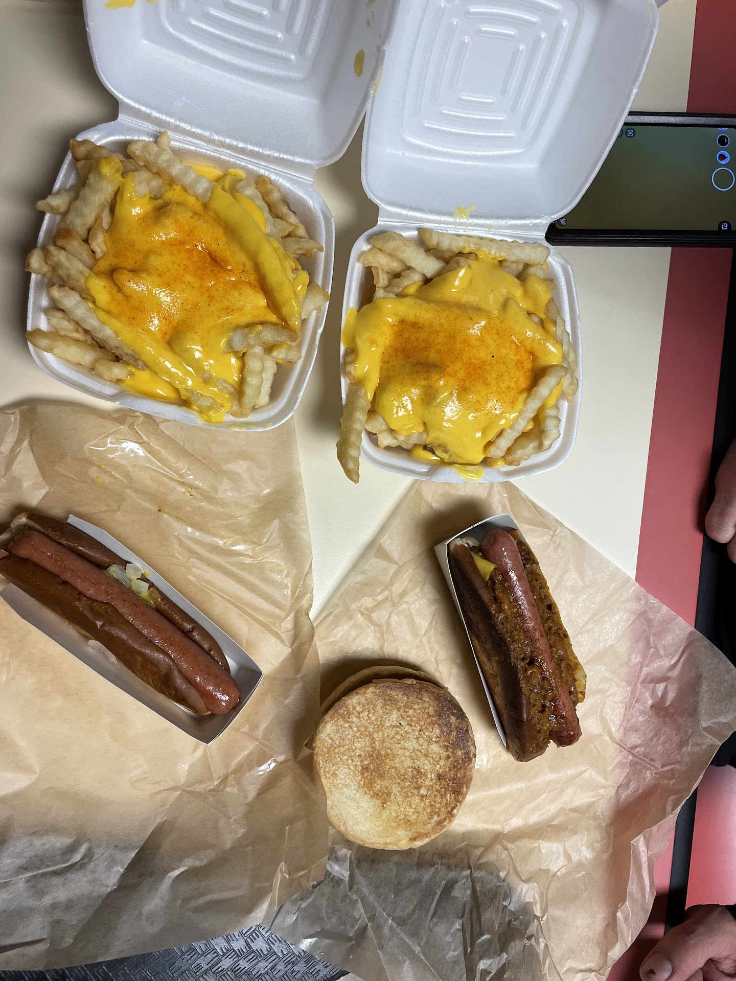 We ordered a little bit of everything being as though this was my first time in. Now immediately I want to say my body does not like fried food so this was a difficult meal for me due to this. No other reason. I didn't know what to expect walking in so this place has almost completely fried food menu. Burgers, hotdogs, sandwiches of the like. They have onion rings and fries. Their portions are huge! We spent just under $40 and got 2 burger hotdog combo meals with half onion rings and half fries, shakes, and chicken rings. The hot dog and burger was really good like classic diner style. Not big not small. The fries were good and cooked well. The onion rings I liked because they seemed homemade, but they didn't taste good. Just no seasonings and the batter used with them I think is a dry batter, I would do a wet batter with how they make them. Maybe throw some beer and seasoning salt in there. Everything was cooked well by a team of men who did a fantastic job. They were friendly and to the point the staff was very great. Overall I got sick from eating all that fried greasy food but the taste was good. I wouldn't do onion rings again probably wouldn't do any fries or chicken rings or anything going in the fryer personally. But I encourage if you have not tried it to give it a Go at least for a burger or hot dog or other sandwich listed on the menu. The chicken rings were pretty good reminded me of Burger King's nuggets from back in the day without the spice. The shakes were really good....