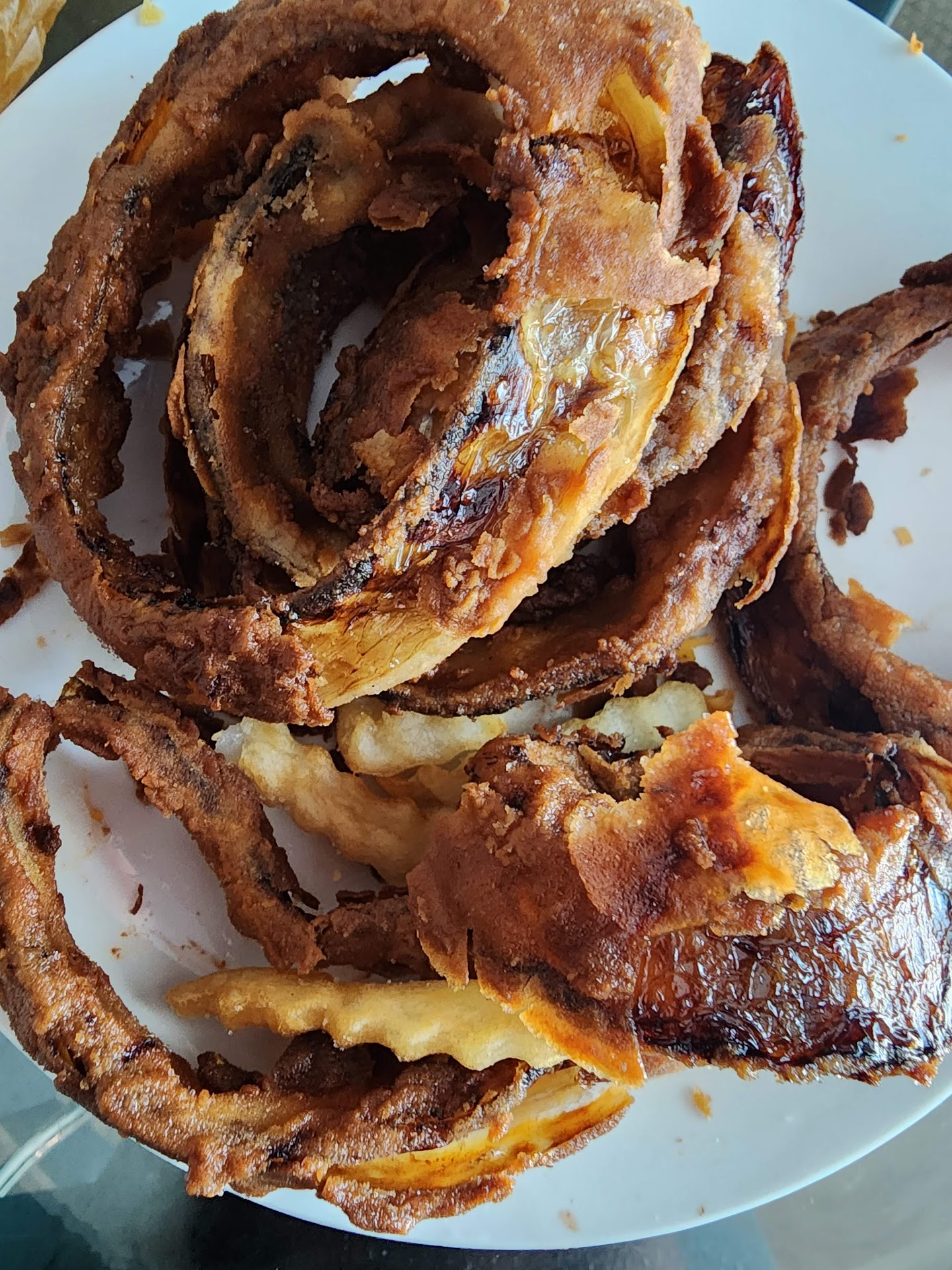 The onion rings were burnt to a crisp and totally inedible. Whoever was working the fryer should have dumped them in the bin and started fresh instead of serving us rubbish.
