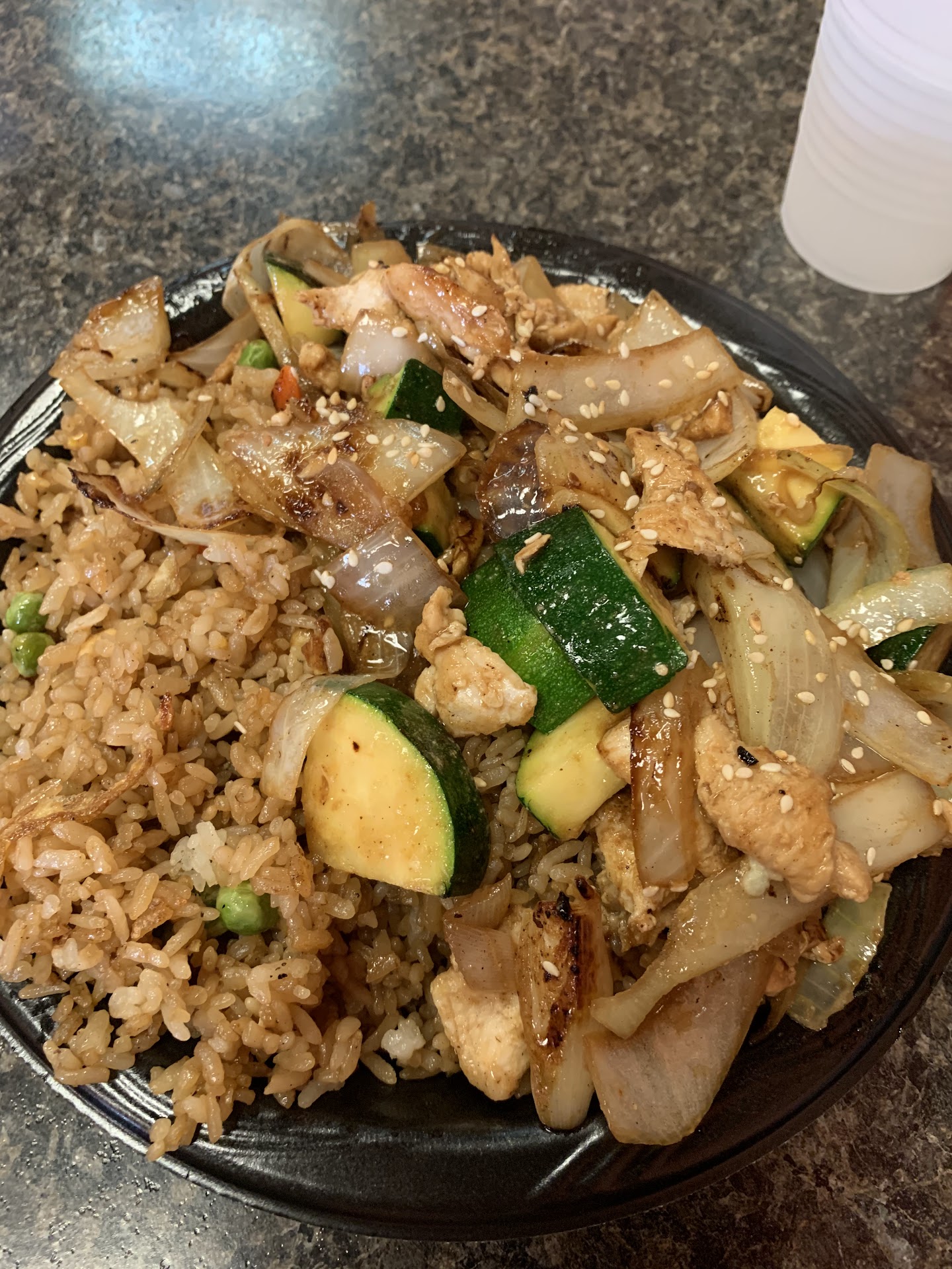 Fried rice was good. Dumplings only deep fried. Not steamed or skillet fried. They tasted like a deep fat fryer. No thanks. I ordered hibachi beef. My beef came looking like.. crock pot boiled beef. Nothing hibachi about it. I wonder if anyone knows what a hibachi grill is? When i ordered the hibachi beef i did not expect a generous serving of fried rice. Nothing on the menu says its served with rice. The menu is always with a glare on it and i can barely read it. Anyway.. im allergic to eggs so i cant eat their fried rice. Staff didnt care and didnt offer to replace my dish. I didnt sense the staff caring about much more than quickly boxing up fried rice for to-go order. lotsa folks [seem to] come for that. Great. Our 2 meals, 2 drinks and 6 overly deep fried dumplings were over $28. What? Hey the dipping sauces were good. And the boiled beef was .. ok. I just put lotsa sauce on it. Like i did that time i was in Japan. The squash and mushrooms in a brown corn starch sauce was ok to taste ... even if nothing like hibachi style. [Hibachi=grilled] note.. the beef was not chewey or tough. Good flavor. Decent proportions for a $14meal .. if you count the small mountain of...