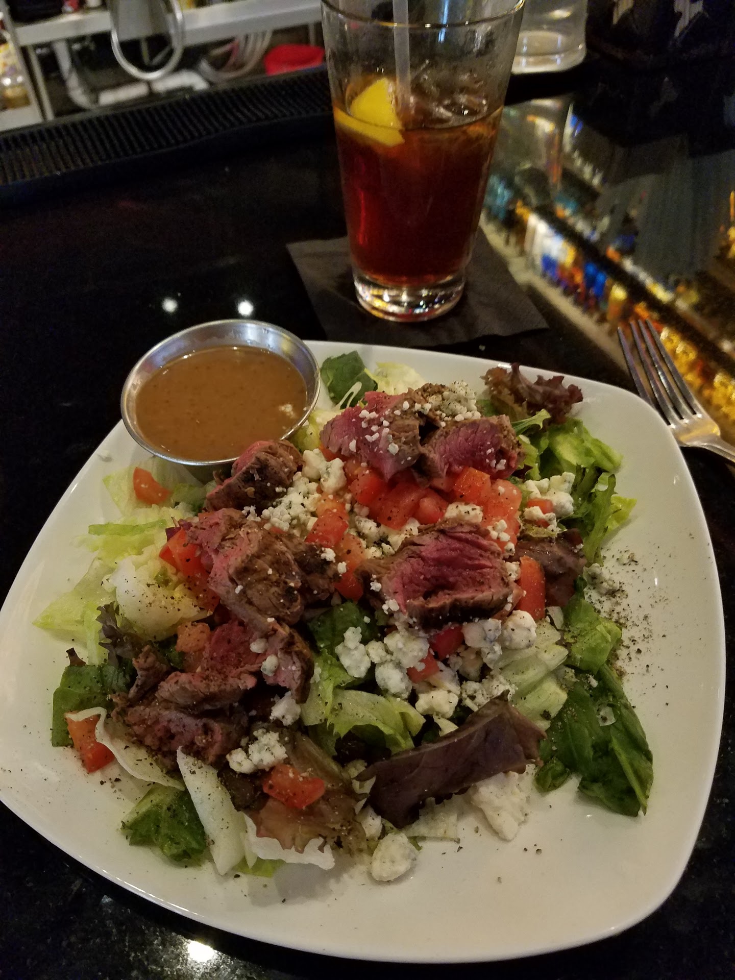Read morePlease Read Entire Review as there is an update... First time here. ☆☆☆☆☆ The atmosphere is beautiful. Prices are on the moderate to slightly higher side, business casual attire. We went during happy hour, which allows you to get selected appetizers at a discount if your sitting in the lounge, patio or at the bar. I also ordered my meal off the dinner menu. I ordered a dirty martini, iced tea, roasted red pepper hummus appetizer (discounted), and the Ahi Tuna appetizer, for dinner I ordered the steak salad (med rare, vinaigrette on the side). My friend Colleen ordered a blackberry drink, a cup of soup, side salad and the shrimp appetizer (discounted) sat at the bar, Britney was the bartender and our server. She was pleasant, personable and very attentive. We placed our order and the appetizers arrived quickly. The hummus was slightly spicy and delicious. The Shrimp were excellent, enough for two or three people. The Ahi Tuna was delicious but extremely overly salted, we only ate half of it. I brought this to the attention of Britney and she tasted it and agreed. Then informed the appropriate people. When my salad arrived, it was soaked with dressing and the steak was med well. I informed the server that brought it out to us before he even sat it on the table. He apologized and took it back to the kitchen. He returned quickly with a new salad that was perfect. The two minor issues we had, were resolved quickly, professionally and above expectation (we were comped the Ahi Tuna app). We will definitely dine here again. Definitely recommend giving this place a try! :)