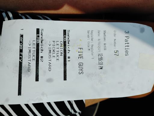 Read moreMy made to order burger was stacked tall, it was a challenge getting a complete first bite mouthful. Five Guys cooks all their burgers until well done (160 degree internal temp) using a smashburger style of prep so you're not going to get any pink running through meat. But that's OK, their proven process does not deny you a juicy burger. Five Guys also knows how to apply bacon to a burger providing bacon in every bite coverage, it is a BACON cheeseburger after all, not a "Bacon on the side" burger, with half slices hanging out like a cow's tongue outside the burger rather than ON the burger... But I digress. This burger was nicely balanced and is definitely worthy of a repeat buy. And even though Five Guys calls it a "Little Fry" on the menu, it's a very generous portion of fries. They were nicely fried, seasoned well and provided the lightly crisp on the outside, fluffy spud goodness on the inside bite you're...