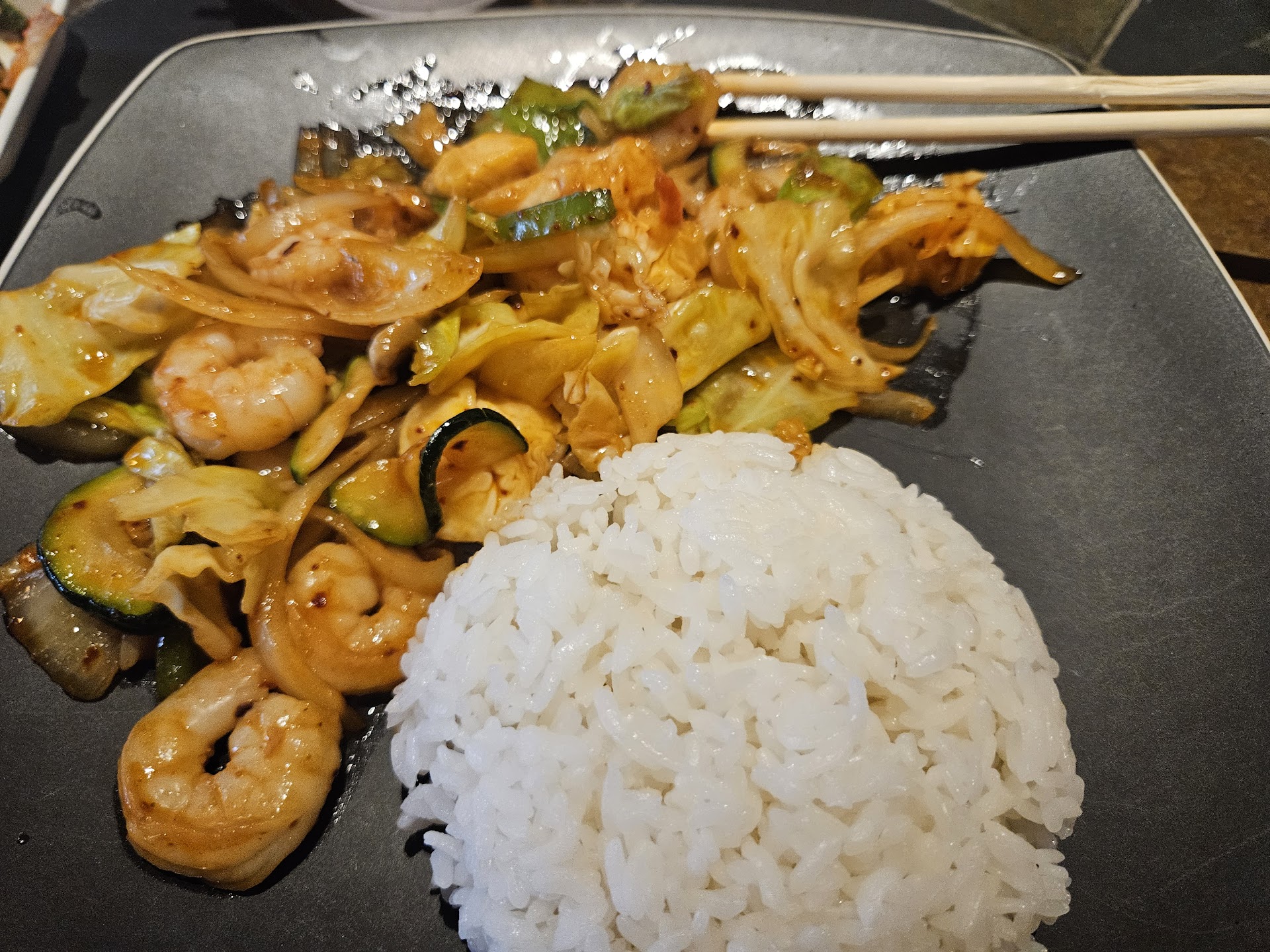 I ordered the spicy chicken, beef, and shrimp. There could have been about 20% more meat. It was good. It wasn't very spicy. Which is fine with me.
