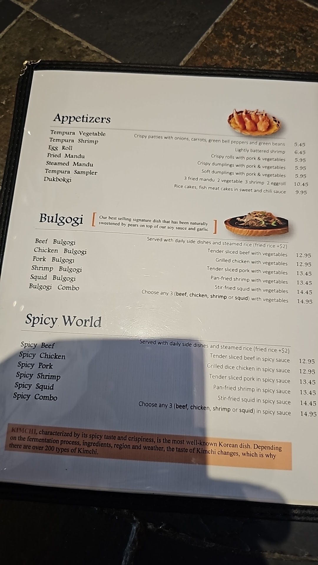Okay, let's see. Overall, pretty good food. Portions are a bit small but you do get a salad. This was our first time eating Korean food. Pretty good.