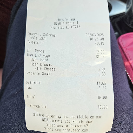 Read moreBeing a regular customer at Jimmys Egg at 8728 W Central in Wichita, KS, 67212 for a number of years, I looked forward to using my free entree gift certificate and going Jimmys Egg to enjoy my breakfast this morning, 2-13-25 at 8.57. I sat down at the counter and as soon as I placed my order, the current woman manager and a waitress came at me with flared nostrils and inappropiately announced loud enough for the other customers in the restaurant to hear her acuse me of leaving without paying my bill on my last visit. The manager blurted out that she was going to watch me while I ate to make sure that this time I paid my bill before leaving. Embarrassed, I tried to explained to the woman manager that the last time I came and gave my waitress a hard copy of the email showing that Jimmys Egg had given me a free entree at my next visit, for being a good customer. I further explained that I had ordered water to drink at that last visit, knowing that there would be no charge for my entire meal. I further explained that I left a large cash tip for my server, even though my bill was ZERO! I further explained that I asked man waiter Austin if I had any balance while using me free entree voucher. Austin said I have zero balance! The woman manager explained that even though I left the hard copy of my free entree with the new waitress at my earlier visit, that new waitress did know how to enter my free entree voucher into their computer, so at todays visit, their records show that I left at an earlier visit without paying my bill. She said that the entire misunderstanding was all Austin's fault becuase he simply said that I should have zero balance. I recommend that Jimmys Egg employees all know how to honor Jimmy Egg's main office gifts to their regular customers and not inappropriately humilate them in front of other customers when they have done nothing wrong....