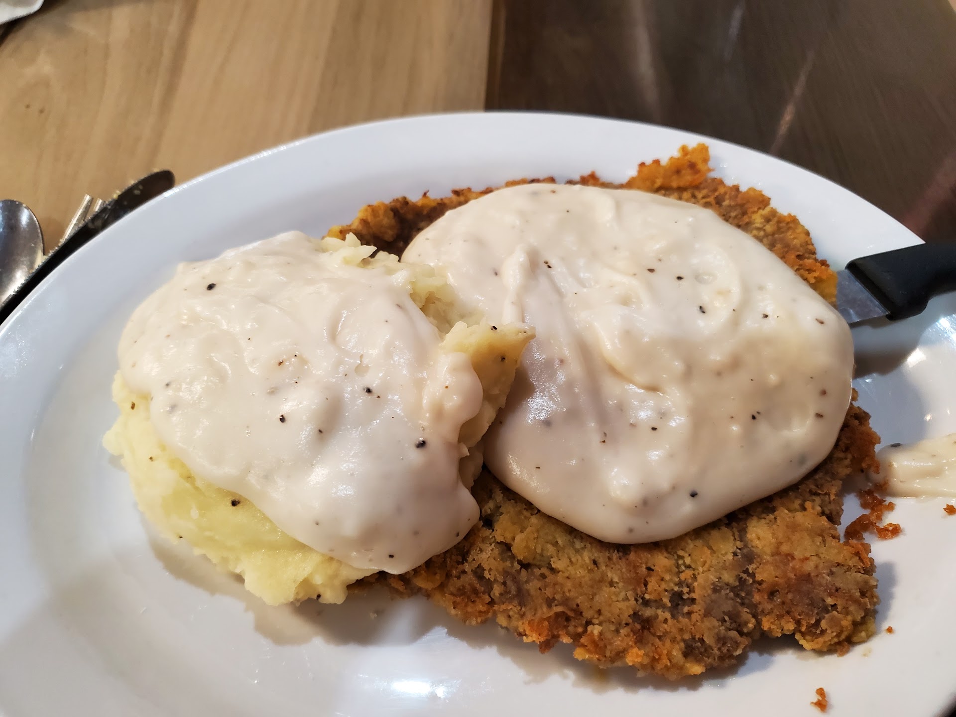 1st time visit. Don't let the neighborhood scare you away. As I thought Oh no... what an i getting myself into. I had originally went for the cinnamon rolls that every one says is the best. I however looked over menu and changed my mind I ordered the Philly Cheese steak sandwich and Fries. The sandwich was exceptional loaded with meat just the right amount of peppers and onions. Waitress did enquire if I would like mushrooms also. Passed on that. The fries are fresh cut there. They were yummy, the size was a little small. My daughter had the chicken tenders.. they were the largest pieces I had ever seen. I tried one the batter is awesome. It fried up nice crispy and light. They were not greasy. She requested gravy for dipping. It was great gravy. Her meal also came with salad, dinner role and vege. She chose deep fried okra. I never did get a cinnamon roll, when we check out the didn't have any icing..SIGH.. It has that family restaurant vibe, the waitress says everything is made from scratch. It was a good choice. Now I'll have to try earlier in the day for...