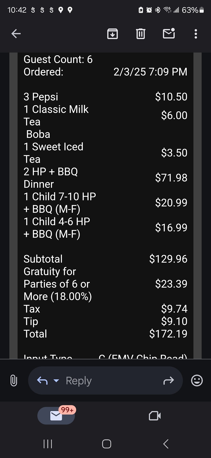 All that being said---it is 2024. Google and the internet exist. You will have a MUCH better experience if you go in with some type of knowledge about this style of restaurant beforehand. I see many reviews where people just appear lost which seemed to make a negative dent in their experience which I feel is easily remedied with basic research. Also, the wait staff at your table explain the entire process right at the start. Minor pointers. Grill the unmarinated meats first--- you will not need as frequent of grill changes and don't be afraid to just ask your server to change out the grill. They are happy to do it. When they change the grill out--be patient and let it heat up nice and hot before adding meats onto it. Adding them too early will cause the really thin cuts of meat to stick horribly to the grill even if it's sprayed with oil. Also, make your first order your largest. We ordered about 15 items to start and then scaled down orders to 4-6 items at a time. That will allow for good pacing if you are big eaters like we are. I saw way too many tables of at least four people only ordering one item. Finally, don't be afraid to adjust your own heat. The buttons are really intuitive and sometimes you just need to turn it down a notch because meat is cooking too quickly.