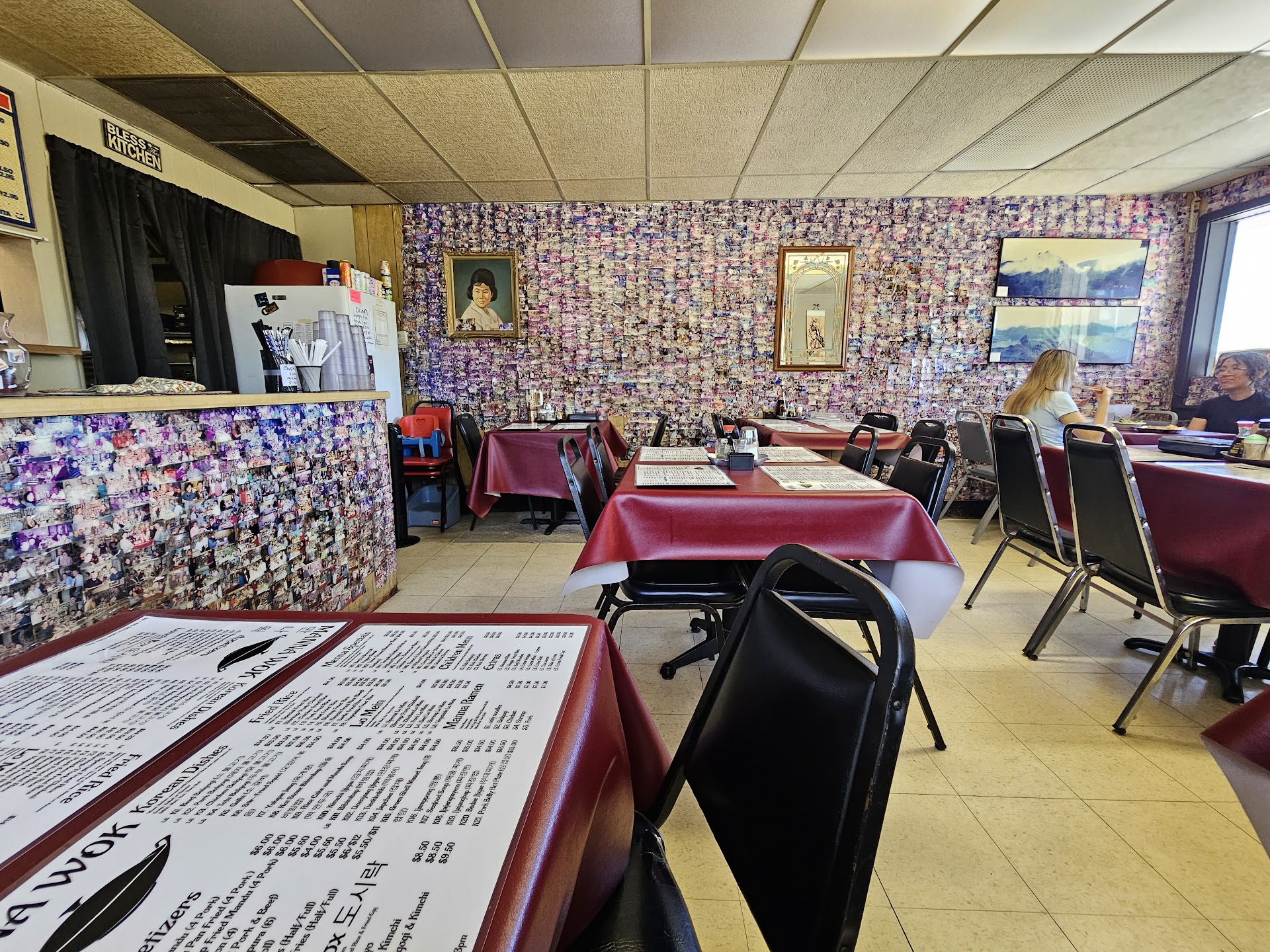 The inside is adorable, quaint and clean with the decor itself being charming and thoughtful. Instead of wallpaper pictures of customers over several decades cover the walls floor to ceiling. The menu is the epitome of mostly Korean home cooking and some more familiar take out Chinese dishes. Be patient as it appears to be pretty much run by two people-- one at the counter and one at the kitchen but the wait is worth it.