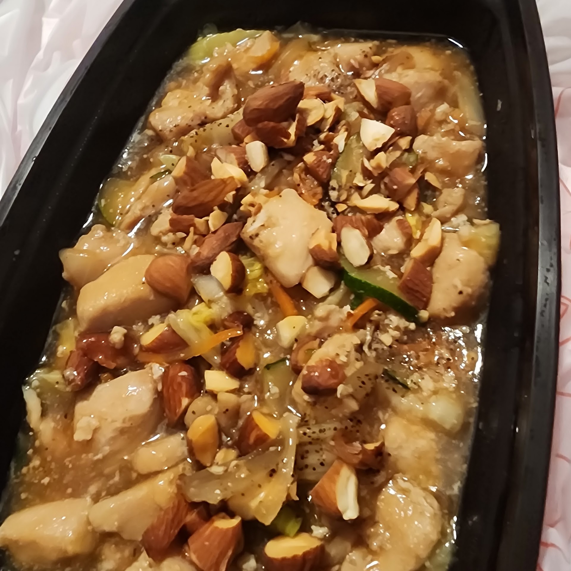 The photo is of the Almond Chicken I ordered. This dish was $12.50. Oh and I got a fortune cookie with it. Let me say with all sincerity that this meal was 100% not worth $12.50. See the bill? No soup or rice was given or offered to my husband when he picked up our meals.