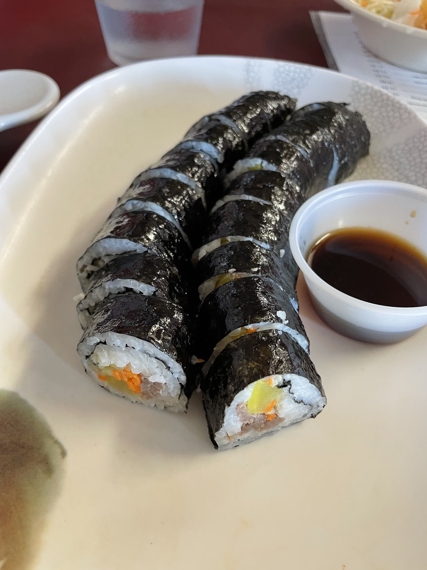 Yaki mandu - made from frozen but honestly, tasty Gimbap - the classic flavors that you look for are all there. This one has bulgogi in it and the danmuji is quite prominent. If you're looking for this to taste like sushi-- it will not taste like sushi. Korean gimbap has its only unique flavor and you'll definitely pick up more sesame flavoring. Kimchi - I fully believe kimchi is a personal taste. There are over 100 kinds and in every Korean home it will taste different. This was for me personally a 7/10. A hair on the salty side for me but the fermentation and spice on it was nice. Extremely generous amount for take out.