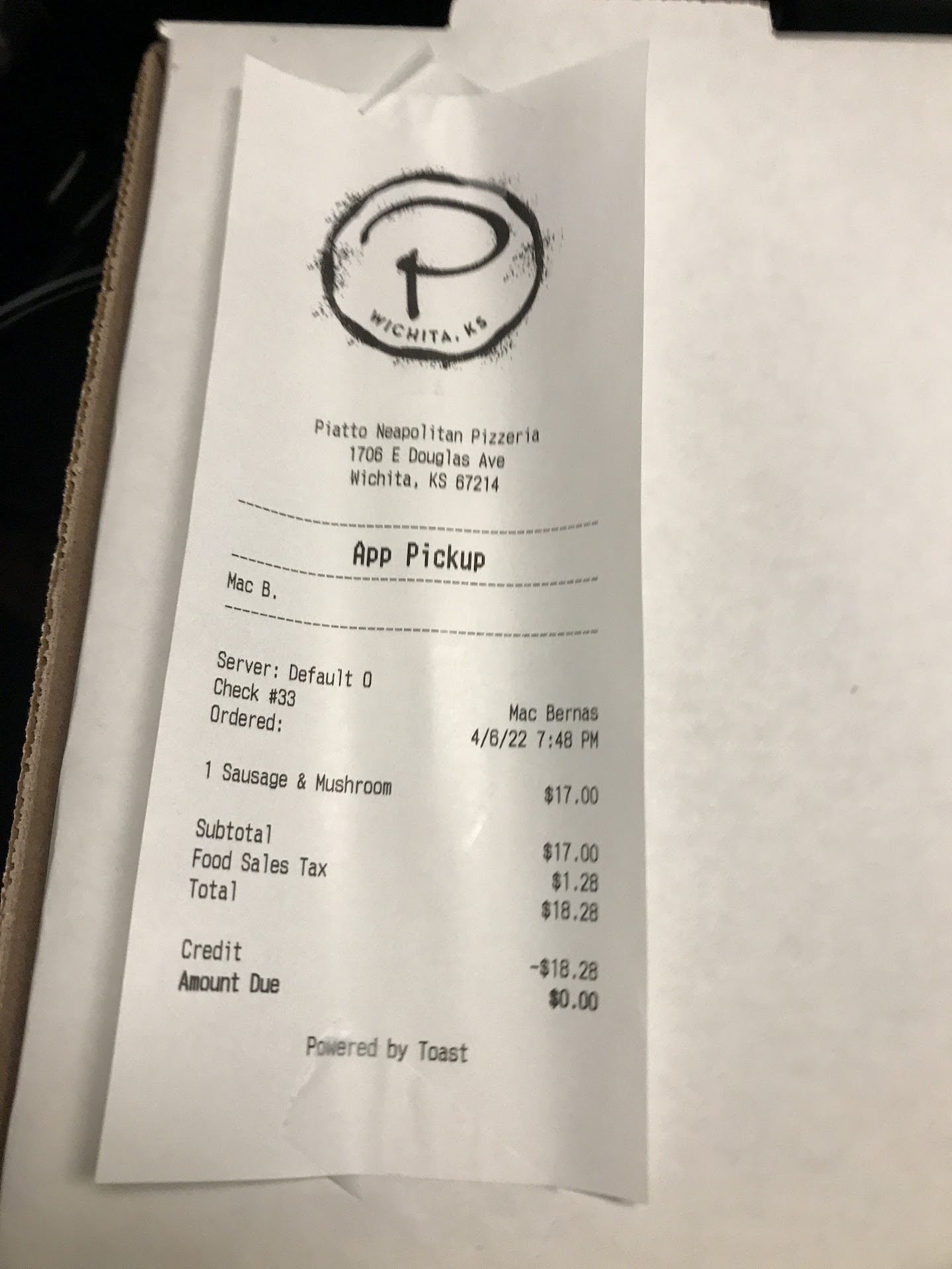 Overall, a terrific visit. I highly recommend Piatto for anyone looking for great pizza in Wichita.