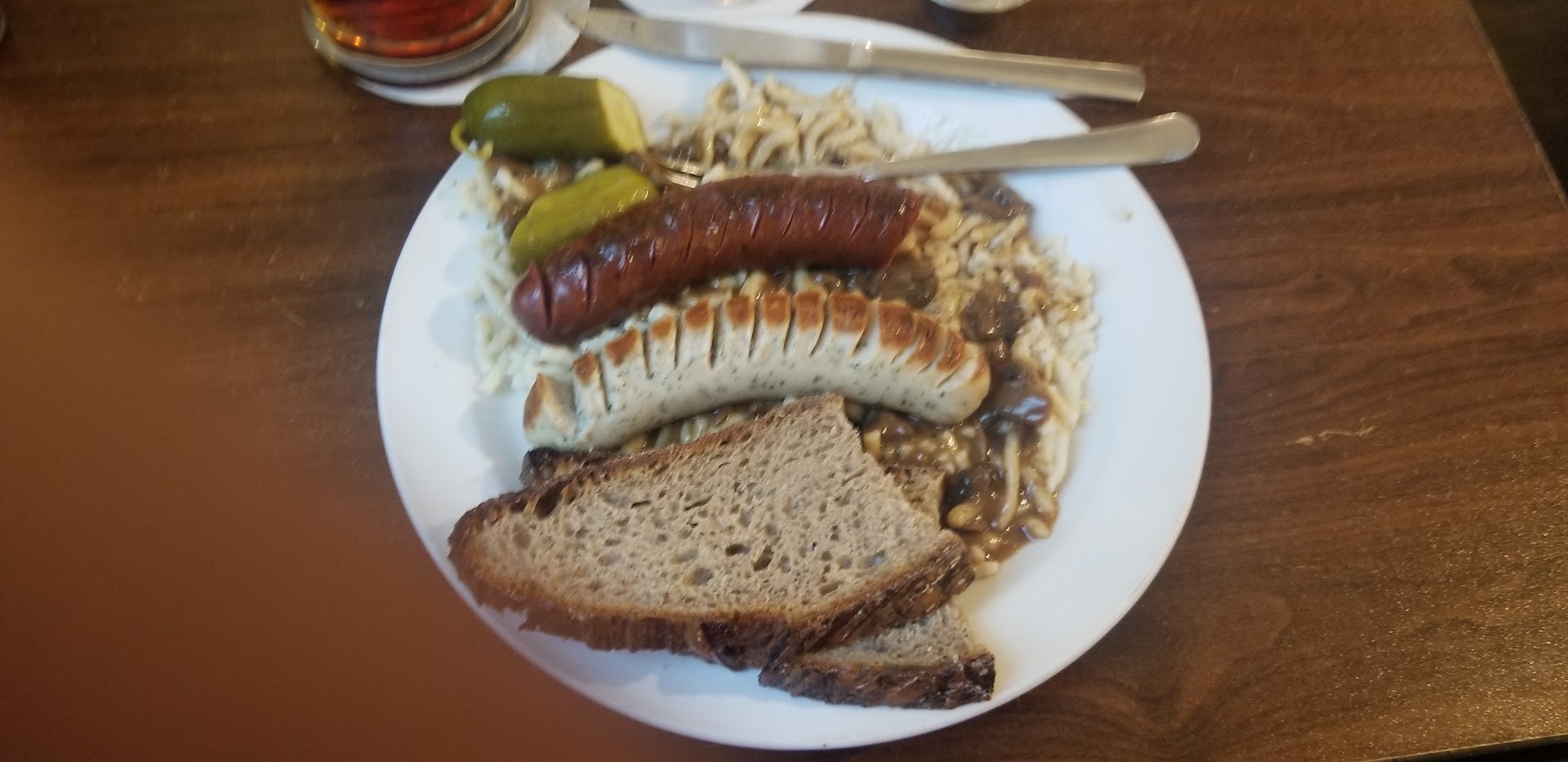 FOOD: The menu is relatively short. The food was good in a German-comfort-food kind of way. Comforting, but definitely nothing stellar. The portions were reasonable. The Flamkuchen was very good. The cold cuts tray could have used a radish or two more (1 halved radish just looked sad). Partner had the Fleischkase (looked/tasted like SPAM, which was ok with us) with egg on top and a side of skillet potatoes and sauerkraut. Both sides very basic. I had the Bierock, with red cabbage and fries. The Bierock was good, but unexpectedly sweet. Not sure why. Fries were warm and crisp. Red cabbage was also sweet. I think next time I'm ordering the Jagerschnitzel. There is a kids' menu, but our kids were happy to sample from the Flamkuchen, the cold cuts tray and our meals. The cheesecake desert was also very basic, with canned cherry topping. I wouldn't put money on the cheesecake being made from scratch either, but I might be wrong.