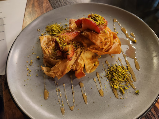 The "Smoked Brisket Hummus" is delectable, and the "Pomegranate Fried Chicken" is heavenly. For dessert (when if its in season) the Baklava which is made in house via Master Pasty Chef Robbie Garlick is 👌👌. The staff I've encountered: Katie and Abby are phenomenal too!