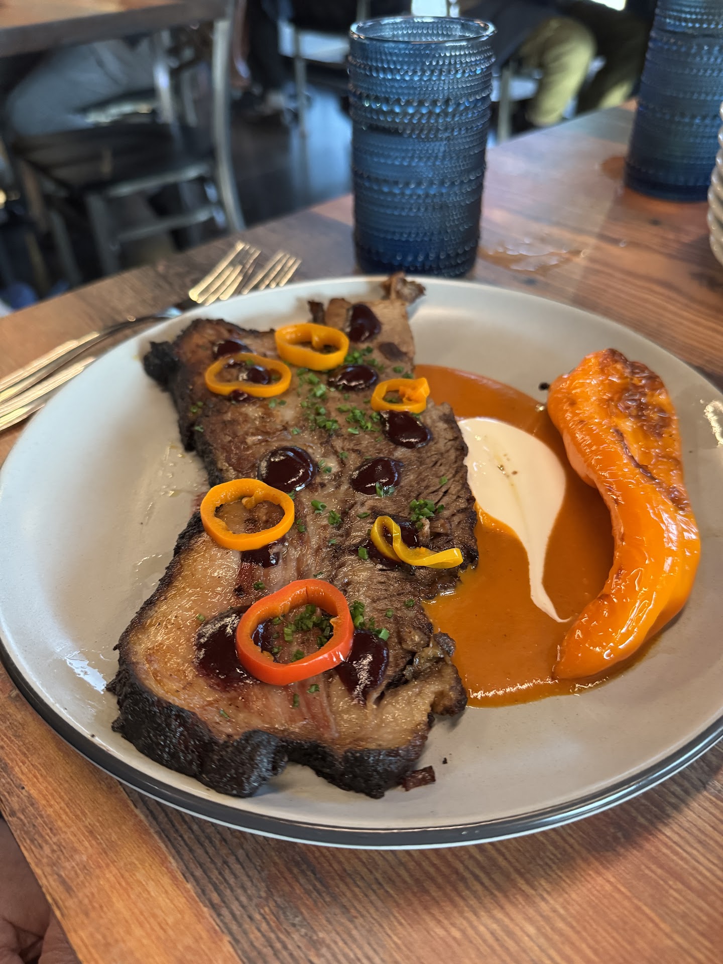 The smoked brisket hummus was also incredible. With the smooth and creamy hummus paired with the richness and bold flavors of the smoked brisket. I’m used to barbecue sauce on my brisket, but I cannot think of a better alternative to Terry Blacks barbecue sauce than this hummus.