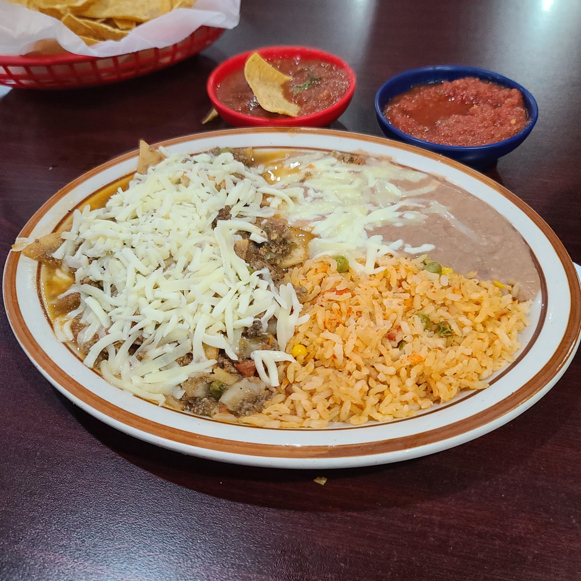 The first bite was a delightful blend of textures and flavors. The tortilla chips retained a slight crispness, providing a pleasant contrast to the rich and tangy green salsa. The beef was cooked to perfectionâtender and flavorful, complementing the zest of the salsa. The melted cheese added a creamy richness, while the fresh cilantro imparted a hint of freshness that elevated the dish. The rice was fluffy and well-seasoned, and the refried beans were smooth and savory, making them excellent companions to the main attraction.