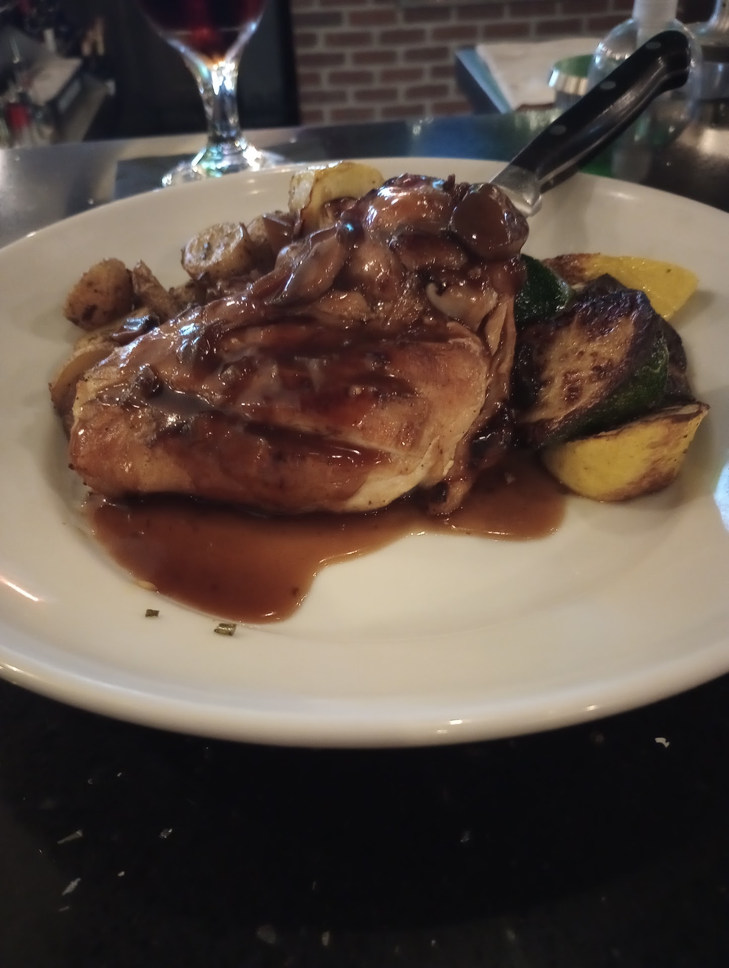 Drinks were brought out and delicious. French onion soup brought to table steaming hot along with bread loaf a few minutes later hot from the oven. The meals were both brought out within minutes after this.