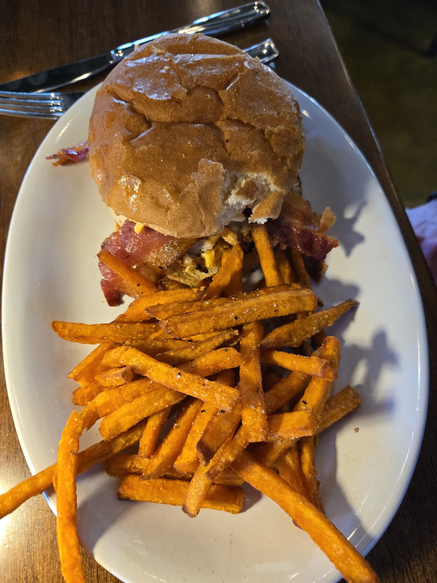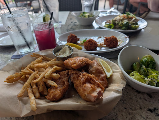 Read moreThe good: The patio is fantastic! The band was great, but a little too loud to have a conversation with the people I was with. The ambiance is impeccable and the drinks were excellent. The bad: I was very disappointed in the food though. Nothing was seasoned at all and it all was pretty bland. My friend and I both got something off the specials menu and we were both disappointed. (One more good: She said the crab cake ball things were great, but I don't like shellfish so I didn't try them.) I got the salmon fish and chips and it tasted like unseasoned salmon with an oily crunchy coating that tasted like absolutely nothing. I even asked for ketchup and lemon to help it out and it wasn't enough. I paid extra for the brussel sprouts that were steamed? Boiled? With slivered onions and pepper. Not sure why garlic and salt aren't staples, but I don't think anything I had included either of those ingredients. When the waitress came by to ask if I wanted a box and I declined she said something about it looking good and I told her that it was pretty bland, she said she would tell her manager. When the manager did come around and we told her our concerns with the food she discussed it a bit with us and used the word slay a lot and seemed pretty receptive to the feedback but didn't even comp anything on the check for 75% of the food going back to the kitchen uneaten. I would have been happy with even a slight adjustment to acknowledge the complaint. I'll go back for drinks on the patio, but I wouldn't...
