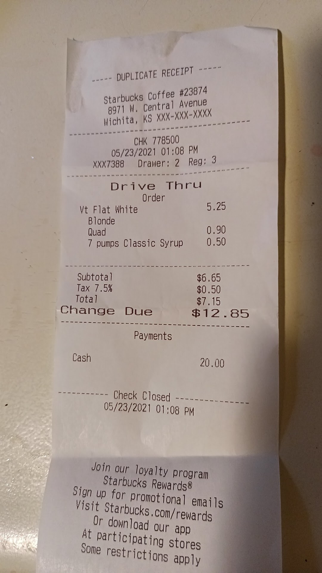 I've gone to this Starbucks every day for a few months. I got tired of the 20 minute wait time AFTER my preorder, using the app, three days in a row at the 21st and maize. I drive thru ordered my usual drink of dark roast and heavy cream and was asked at the window if they could sub the Pike's instead. Unless I wanted to wait, of course. It was 5:35am and I'm on my way to work so I choose to sub the Pike's still using a reward. I drove 5 more minutes to work and sat down to drink my coffee and as I took a drink, I tasted chemicals. I moved quickly to the trash can and almost threw up it was so bad. With the lid on I didn't notice a smell until I took it off. It was horrible and was glad I didn't swallow it. I called the store and they were mildly apologetic offering me a free coffee the next day when I came in. That won't cut it for me. I'm not saying I won't go back but it's been five days and I've been coffee free.