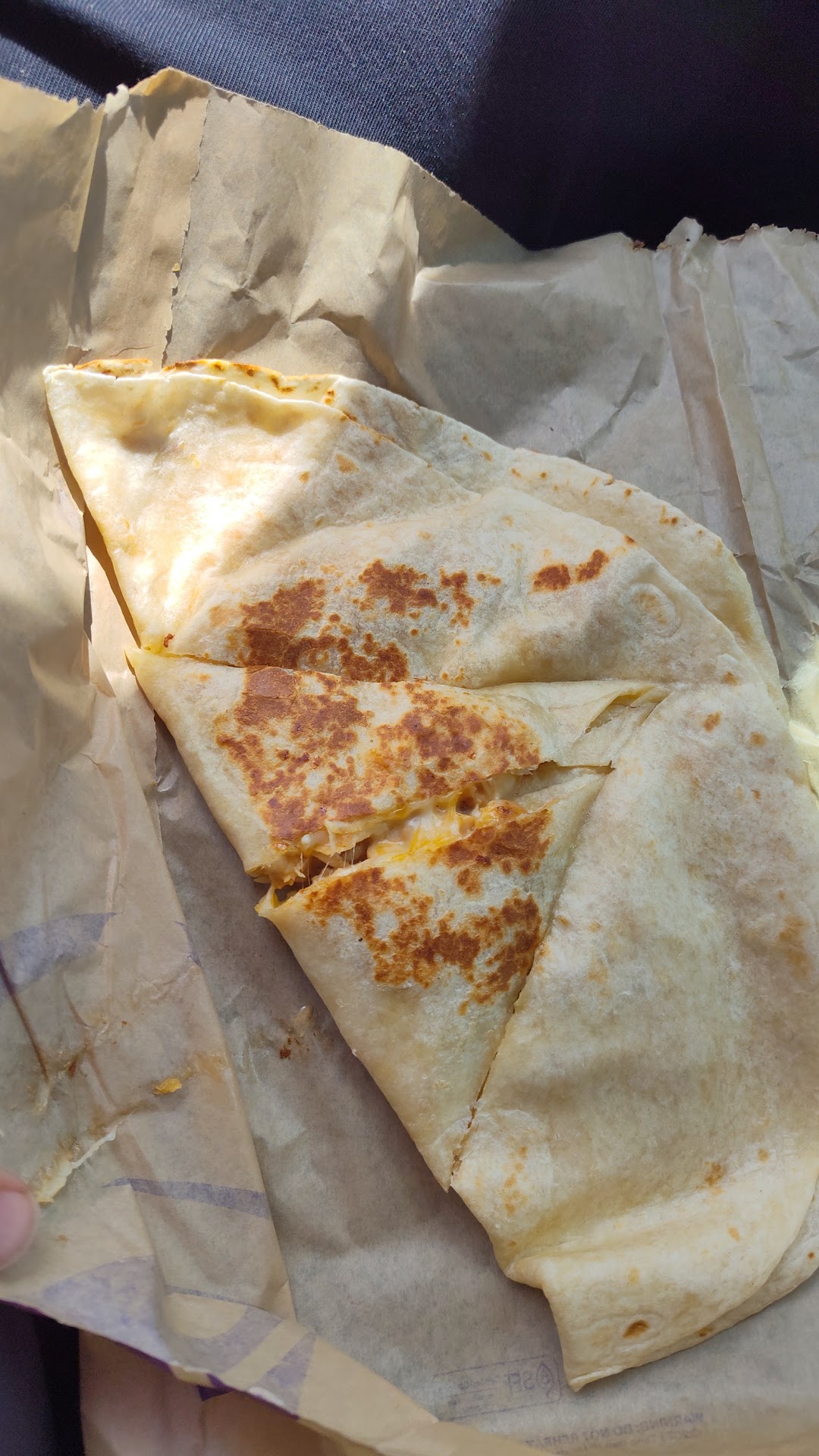 With my first bite, I noticed how there was no texture to this "taco," no crunch to speak off, the consistency of all the ingredients was the same. Perhaps if I would have gone with bacon, there might have been a little crunch, some texture in that breakfast bite. The whole thing was just soft... Soft, as in not lightly caramelized, crisp on the outside tender on the inside potato; the soft sausage (to be expected); the melted cheese (also to be expected, it's melted cheese....); all that wrapped in a soft egg despite being fried. You would think the edges of that egg would have some crispiness to it, but surprisingly, it didn't. In fact, I found the Naked Egg Taco to be greasy. Being a new item, I'm wondering if it was prepared correctly. It comes with a little holder to eat it with, but this was beyond eating a fried food not wanting to get a little fried tastiness on the fingers, this "taco" was greasy both in presentation and taste. I was left wondering if the fryers at this particular Taco Bell were at the correct temperature. Good fried food is crisp, with no greasy aftertaste. That certainly wasn't the case here. An educated guess tells me the fryer temp wasn't hot enough.