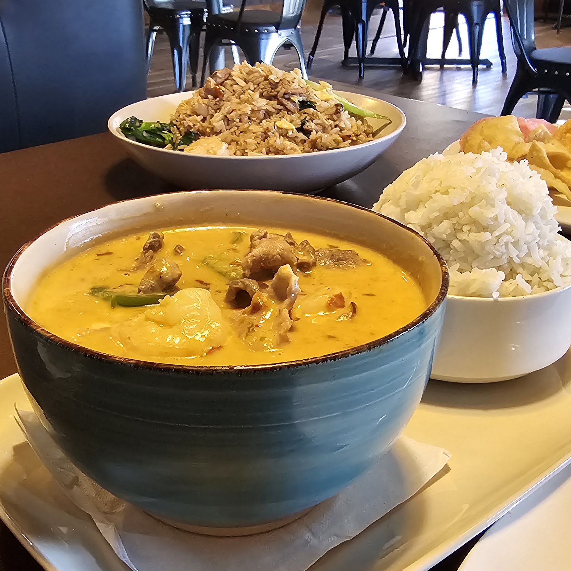 Today, Saturday Feb 3rd, I enjoyed a tasty lunch in a surprisingly quaintly decorated restaurant for a mini-mall setting. Our server, Deborah T., pushed our experience to delightful with her friendly, helpful, and personable demeanor. The restaurant served a complimentary wonton and shrimp chips with a sweet Thai dipping sauce. I think they sometimes serve a complimentary soup sometimes, according to my lunch partner. We shared their delicious steamed dumplings served with an incredible house made ginger dipping sauce that was a welcomed change from the traditional chili oil. My main course was a pineapple, cucumber, onion, and tomato wok dish in a lightly sweet sauce, with medium heat spice level, steamed white rice, and with shrimp for the chosen protein. It was delicious. The veggies and pineapple were fresh and perfectly cooked. I wasn't crazy about the tomato as it was unexpected. I don't recall tomatoes in Asian cuisine; however, it was not a detractor despite being unexpected. Lastly, I shared a never before tried Thai dessert dish. It was a warm, sticky rice in a thick, and mildly sweet cream sauce, and then topped with a nice scoop of vanilla ice cream. We killed it. Thai table will see me again soon. My next tries will be for their red and then yellow curries. Oh, for the two of us, we shared an appetizer, a soup for one entre, a regular entre, and a dessert, and the meal cost a reasonable $37 that...