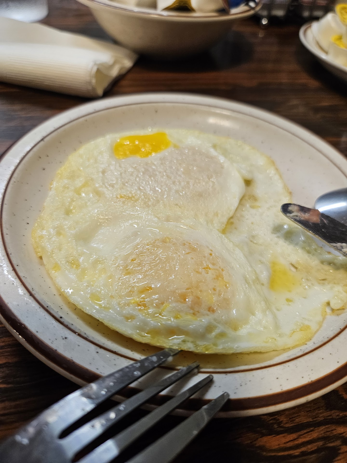 On this visit I ordered pancakes with strawberries, two over medium eggs, and coffee.