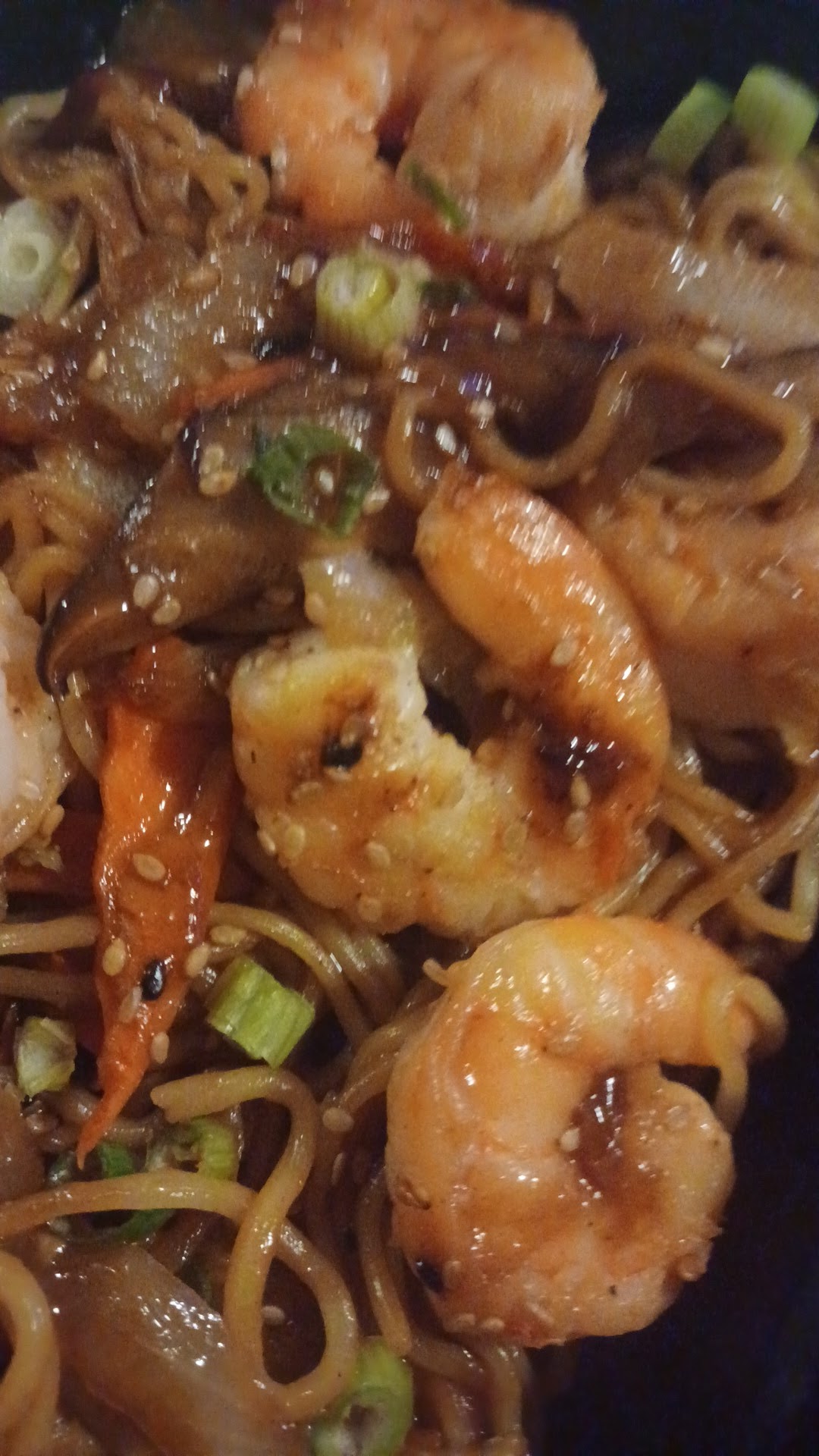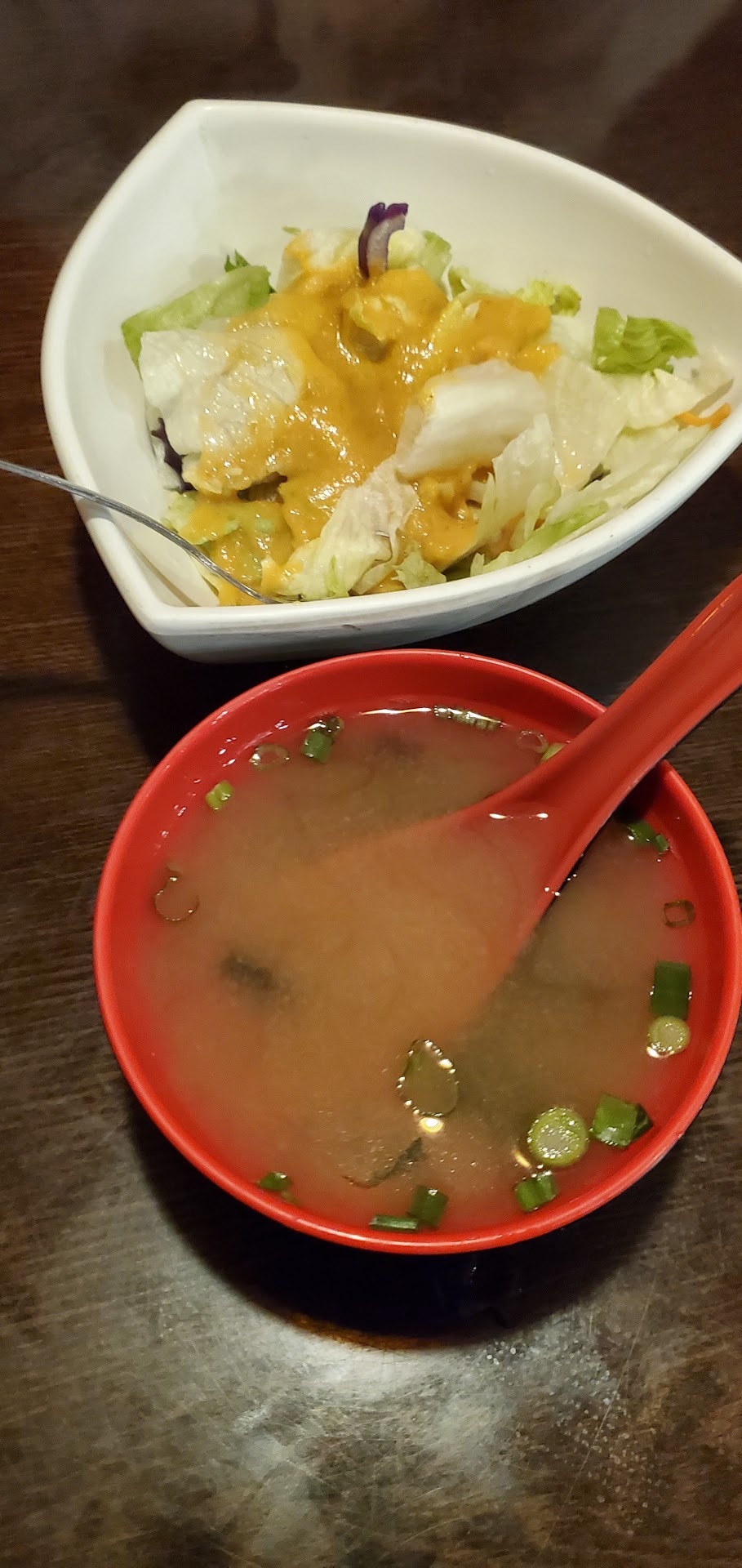 I ordered a spicy salmon roll, shrimp yakisoba, house salad and miso soup was included.