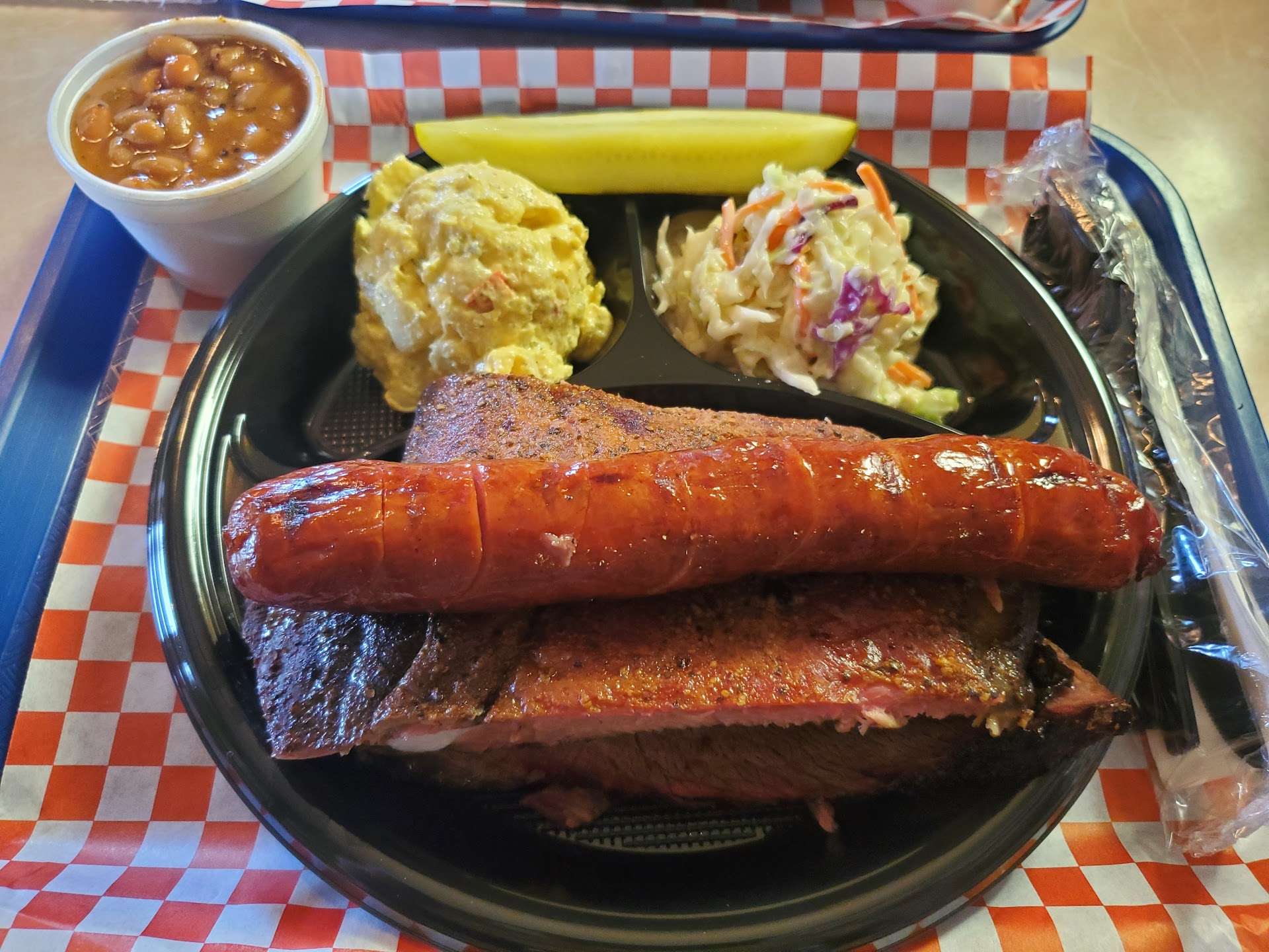 We ordered a mix of things to try and get a wide range of flavors. This included the ribs, pulled pork, brisket, and sausage. The ribs were tasty and I really enjoyed the rub on them. The pulled pork was great and just the right amount of juicy, not dry at all. The brisket was a little more dry than I might usually like but paired with the sweet sauce, it ended up hitting just right. As for the sausage, wowza! I hit something spicy in mine. My friends I was with didn't think it was too spicy so I guess I just got the spicy part in mine. I ended up putting the sweet sauce on it but it still had a good kick.