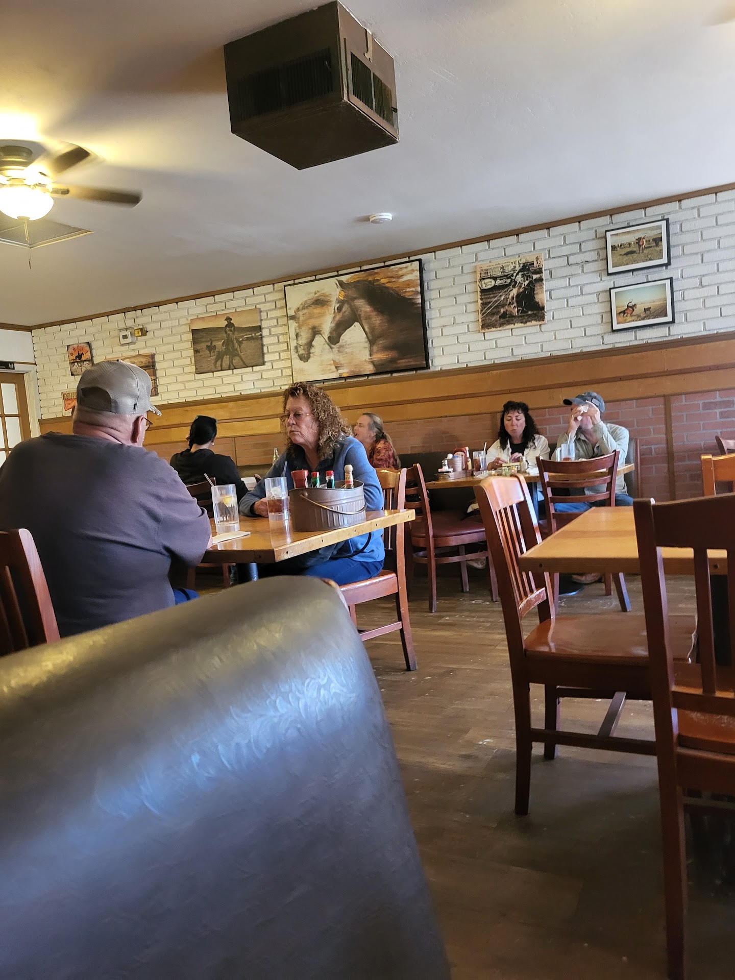 Read moreWe arrived just before lunch and did not wait for a table. Some who arrived a bit later did experience a seating shortage. The dining room is clean with a cozy cowboy theme. The booth we sat at had a badly torn bottom cushion, which wasn't most comfortable. All the staff we encountered we friendly and promt. With some of the regulars even receiving hugs. Portions here are very large, and the food comes out quickly. George's western omelet was thick, loaded with ham, cheese, peppers, and onions. Sourdough toast was thick with plenty of air pockets. Hash browns were cooked nice and golden brown, unfortunately only on 1 side. My eggs Benedict had a large English muffin, a generous portion of ham, beautifully poached eggs, and a Smothering of superb hollandaise sauce. Sausage gravy is chunky and well seasoned. We will definitely return, but next time, I'll take...