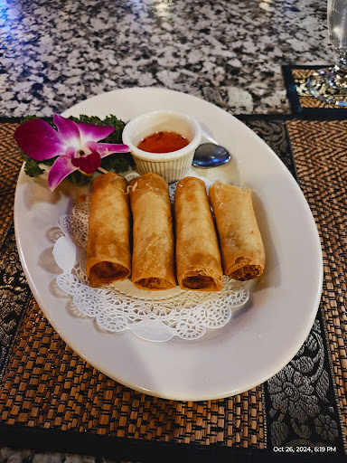 Before my main dish, I started with spring rolls, which were crisp and served with a tasty dipping sauce, making for a great appetizer. To finish, I had Thai custard, which was light, creamy, and served with a generous dollop of whipped cream. Both the appetizer and dessert were attractively plated with orchid flowers, adding an elegant touch to the overall dining experience.