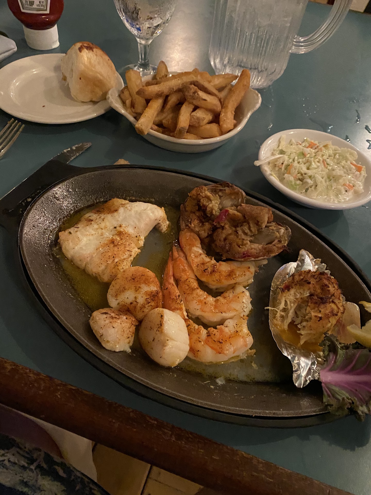 Got our table. Server was nice. Rolls were blah. A little stale. Butter cold and hard to spread. Salad was family style, kinda like olive garden. Just meh. Clams casino and calamari were not bad. Raw oysters did not taste fresh. Dinner took forever to come out. Scallops were chewy. My husband said the steak and lobster were chewy and that he's had better surf and turf at Outback steakhouse. Just nothing tasted very fresh or well cooked. One of our party asked for a refill and server walked away without asking if anyone else wanted a refill or even giving us a chance to ask for one. Our drinks went empty for a while.