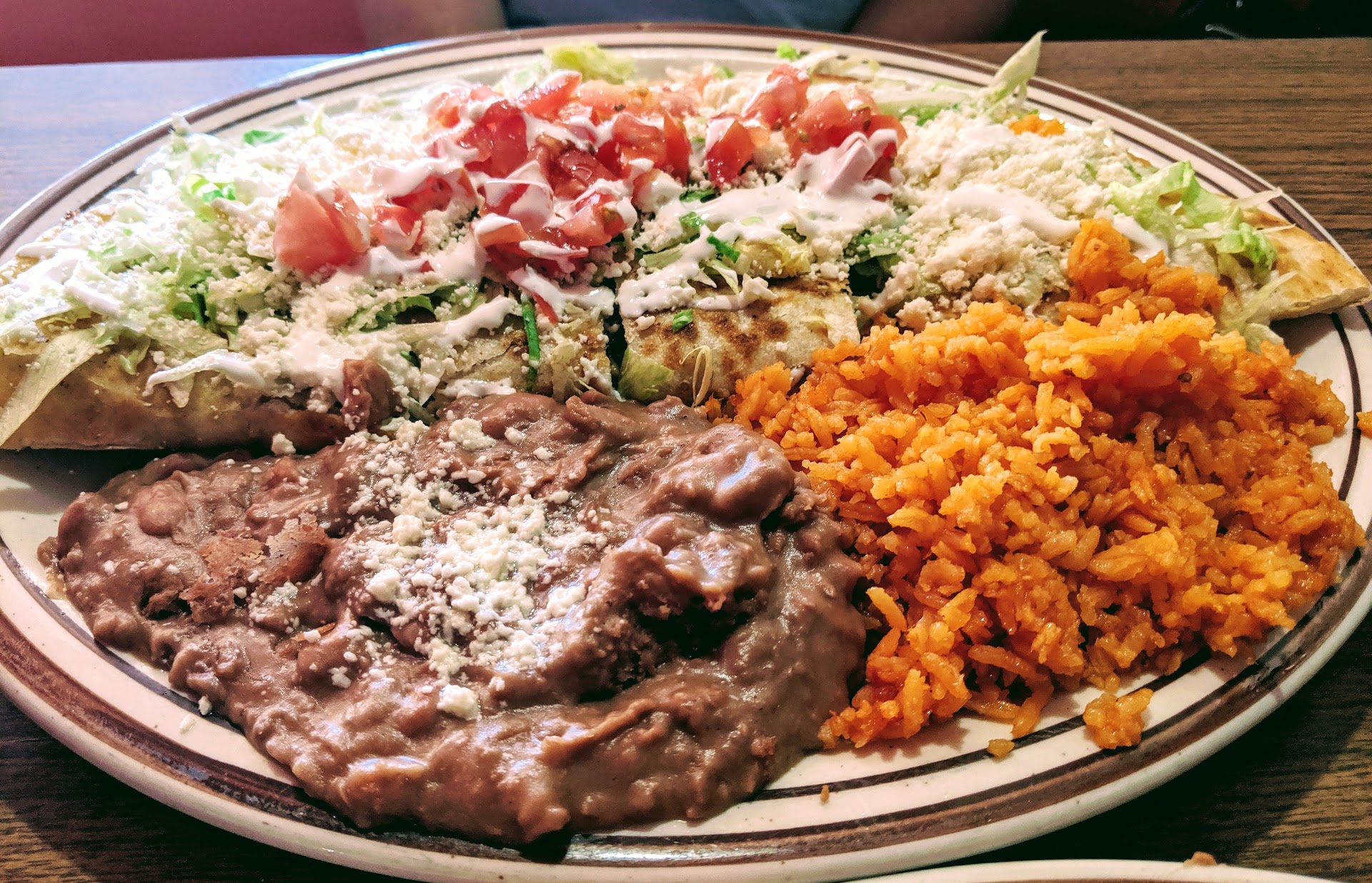 We had the steak burrito and goat tacos. The burrito was massive. It was mostly stuffed with rice, but still it was pretty good. The goat tacos were great. Very simple, but very good - goat bbq on flour tortillas with lime and garnished with radish slices. I got beans and rice on the side. The beans didn't taste like they were fried with a lot of grease, so while they mIght not have been as rich in flavor as other refried beans, they were pretty good and didn't really weigh me down.