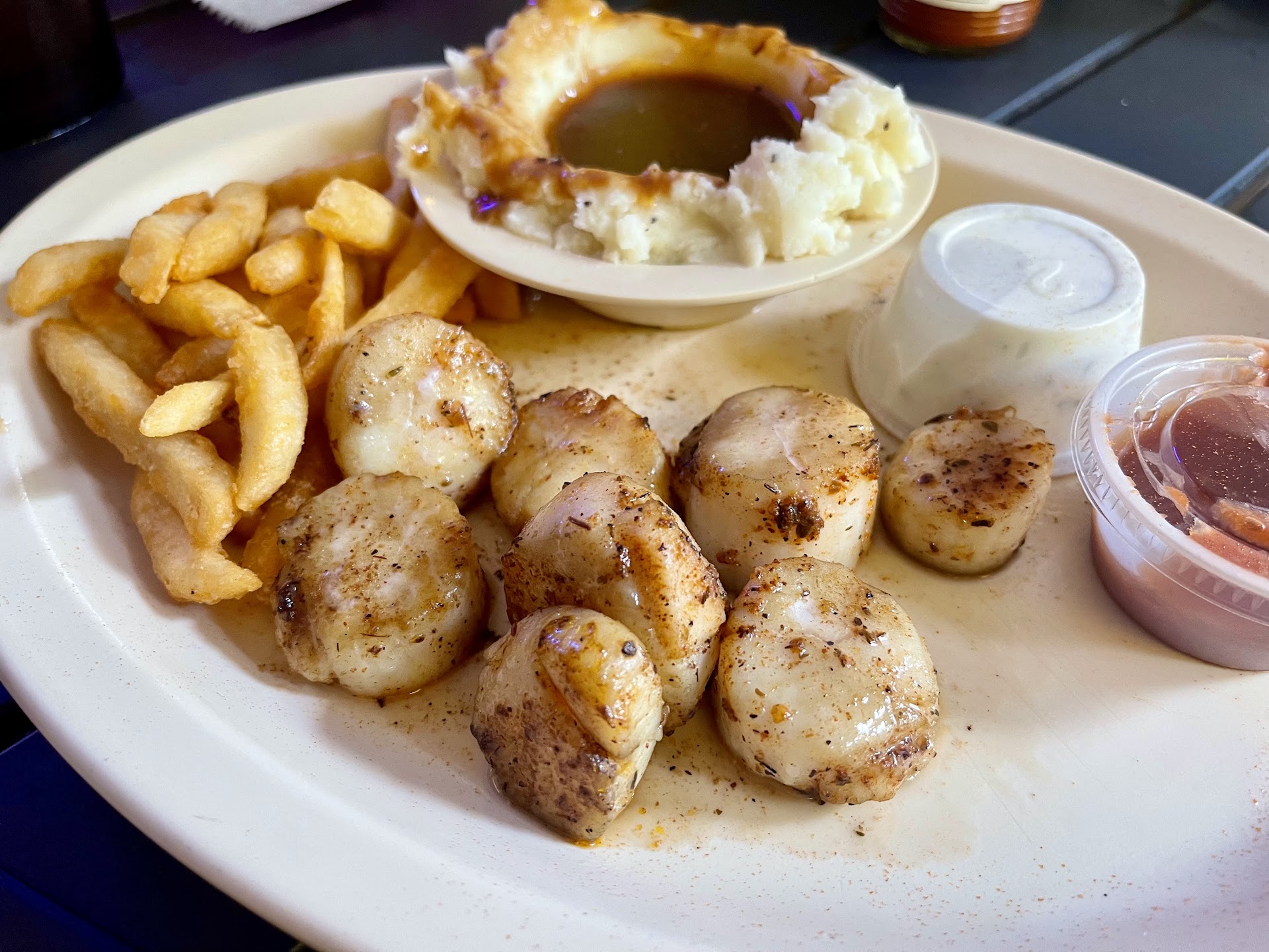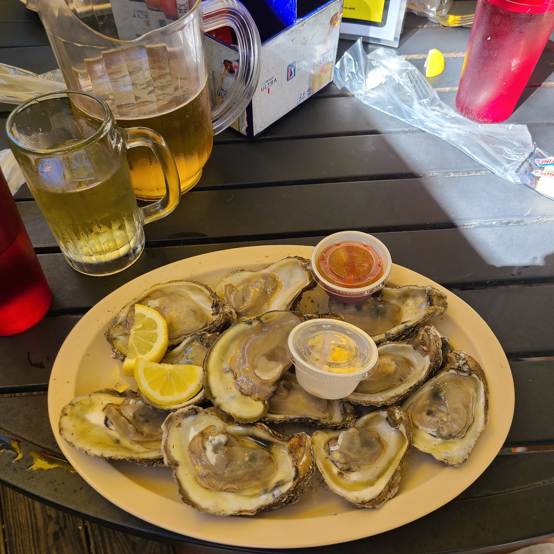 Read moreO'Shucks is the place to go when you're tired of tourist ridden Florida and want a place to eat where the locals go. Here's a fine little restaurant that has oysters, raw or lightly fried, on special every Wednesday. That's the reason I went while others had the wonderful fried native shrimp. They also have dollar drafts of Coors to enjoy with whatever homemade locally sourced seafood you choose. The parking lot is unpaved, the building is nothing fancy and the style is pure native Floridian. My goal was to have the oysters with an O'Shuck's draft and listen to friendly conversations around me. Hearing about bass boats, fishing, and pickup truck comparisons was a welcome change from tourists complaints and adventures. We chose to eat outside under the umbrella on a tidy white round table; we could've been inside but, hey, I'm in Florida in early April and it's a beautiful day. First up - beer. Cold frosty one please. A plate of 12 raw oysters on the half shell is next - perfectly cold, fresh, and served with a tangy homemade seafood sauce. Ah, that was good. Next course is fried oysters with French fried potatoes and homemade coleslaw. Perfect. Desert? Another dollar beer please. Well...