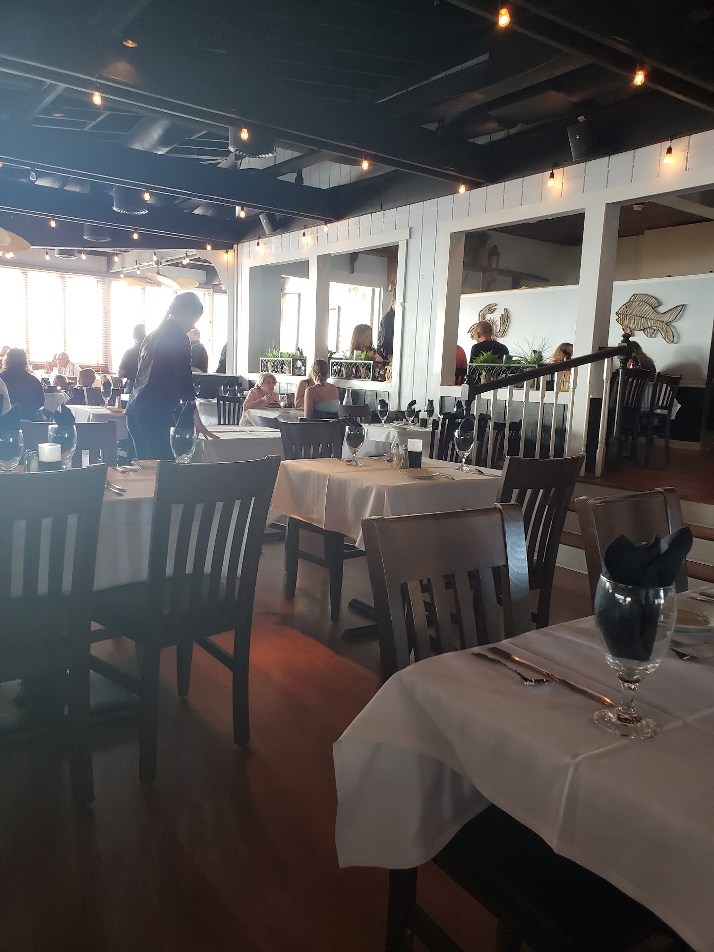 Absolutely disappointed š. To start, The Wharf has outside and inside dining areas. Each section has their own menus and the table set up and ambiance is completely opposite of the other. For this visit we chose to sit outside... luckily we did because we certainly weren't "dressed" to sit inside. The evening view over the water was beautiful however, no where close to relaxing. We had to find our own seating (the entire area was jam packed). There was a band, people were singing and dancing and it was super loud too...we loved it!! We were greeted almost immediately upon sitting. Our waiter was THE BEST!! With the rush and amount of people, he was very kind, patient, smiled a lot and provided honest food option opinions - we should've went with everything he said. I guess since we sat outside we got silver plasticware and paper cups (inside tables have full place settings). Our table started with drinks and the Sticky Spicy Shrimp App (basically bang bang shrimp). The app was brought out within a minute of ordering... Wow!! We thought, that was awesome... but also a little to fast. They were so delicious we ordered another... again, this was brought out within a minute. Our drinks were awesome, so I'm sure any one ordered would be just as delicious. Next we ordered our food and once again, it ALL came out within minutes. Maybe it's just me but this isn't a fast food place so I'm really hoping that we didn't get frozen food or precooked meals etc... I ordered the blackened fish tacos. I was so excited for these but unfortunately ultimately disappointed. The flavor was great, unfortunately my fish was basically fish jerky and not fresh fish. The same thing happened with my friends meal. Her chicken was way overdone and dried up. She replaced it with the waiter recommended buttermilk chicken sandwich- which she and my son both loved. I ended up with a kids meal of tenders and truffle fries... I got that in like 1 min flat. My fries were cold and the tenders tasted worse than the kids freezer ones I have for quick eats. We also figured out that chicken was possibly the same chicken used on the returned chicken sandwich. My daughter ordered salmon over asparagus, garlic mashed, topped with lump crab and a hollandaise sauce. It was ok... the salmon lacked flavor though... maybe that's because it was served within 5 minutes. š certainly not the meal we expected for a couple 100 dollars. To end the night all 4 BR stalls were out of toilet paper. I would've gave 1 star had it not been for the beautiful view, wonderful waiter and...