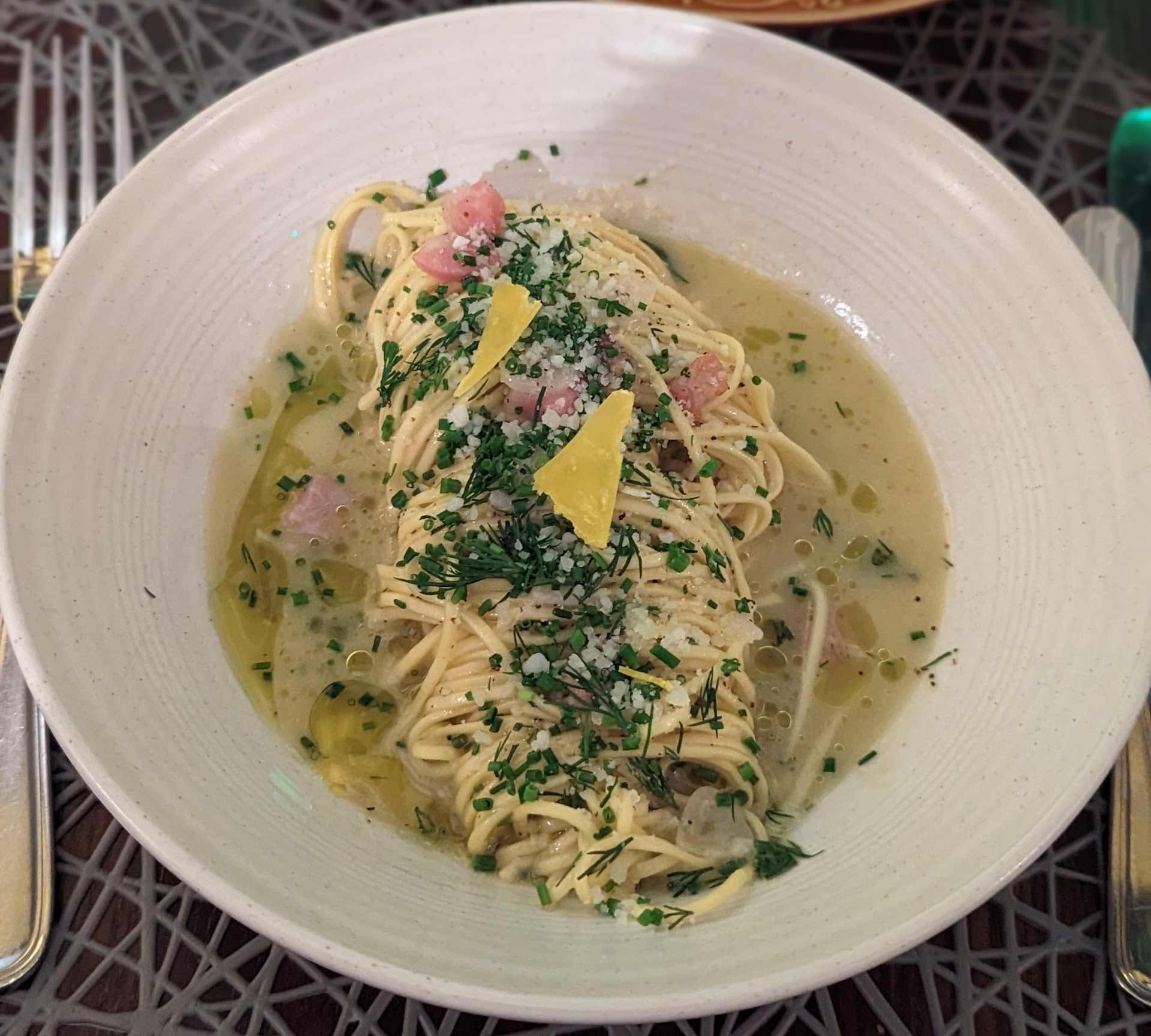 I had the Tagliatelle Cacio e pepe with Guanciale and hard egg yolk, which was heavenly. The sauce was very creamy, the pasta served al dente, and the portion adequate. The pepper in the sauce was not overpowering, and blended well with the Guanciale.