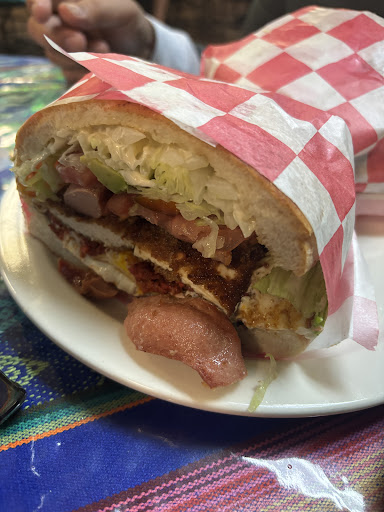 Torta de Los Dos Carnales Especial - toasted Mexican sandwich with a mixture of your choice of breaded chicken or beefsteak topped with fried egg, avocado, lettuce and salsicha. Comes big enough to feed and satisfy 2 persons.