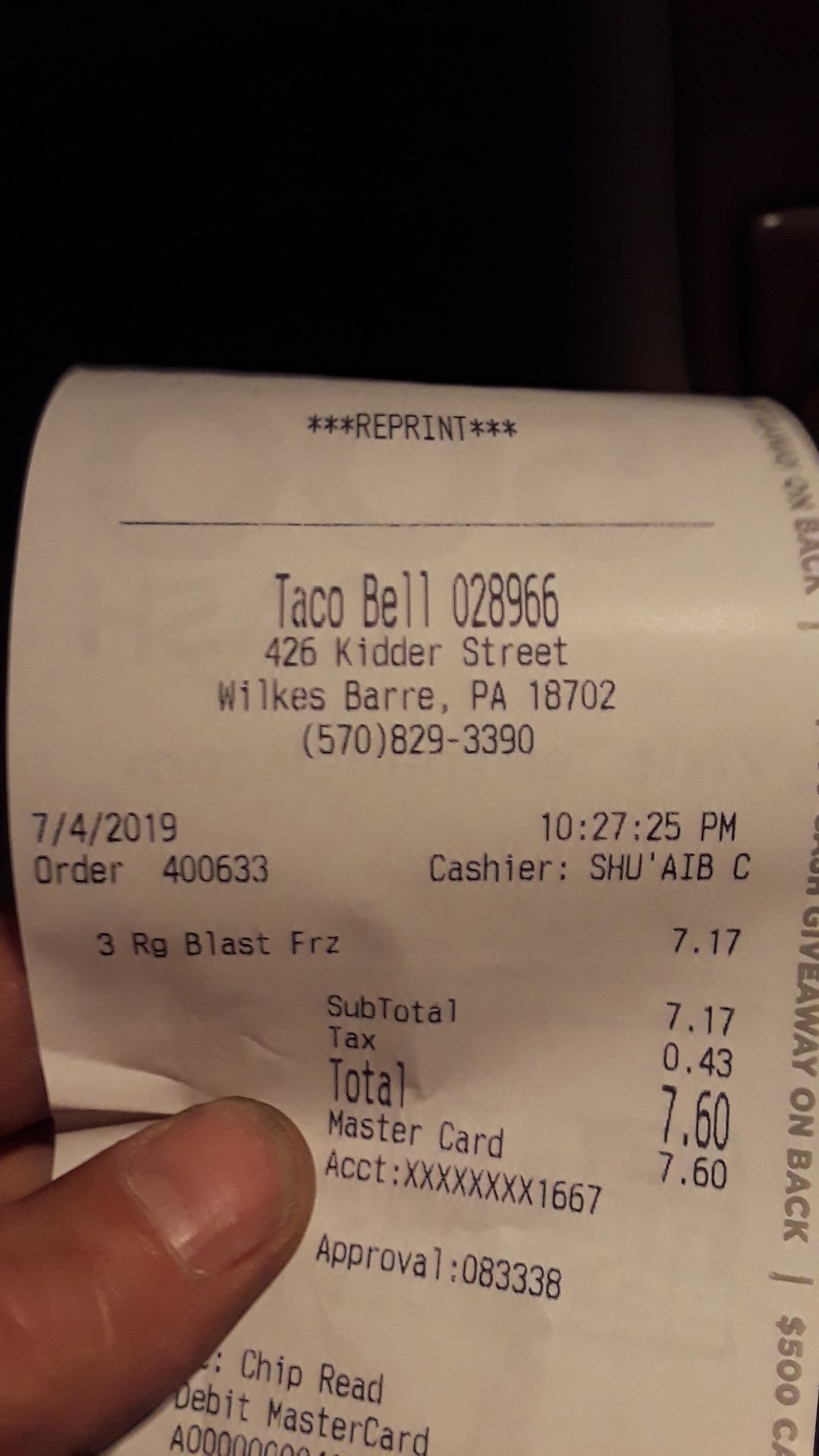Read moreThe girl at the Kidder St. drive thru just told me that I could not order the Taco and Burrito Craving Pack, stating it was an online Exclusive. I repeated the order 3 time pointing out that I have ordered it via drive thru before and I was looking right at it on the drive thru menu. Instead of asking her supervisor is she was mistaken, she asked me if I was done being rude? By the way she was very mistaken, I spoke with her Sup who verified the Taco and Burrito Craving Pack can be ordered via drive thru. The my Craving Box was the exclusive, and perhaps his employee misheard me. She misheard me clarify the order 3 times? They have lost all future...