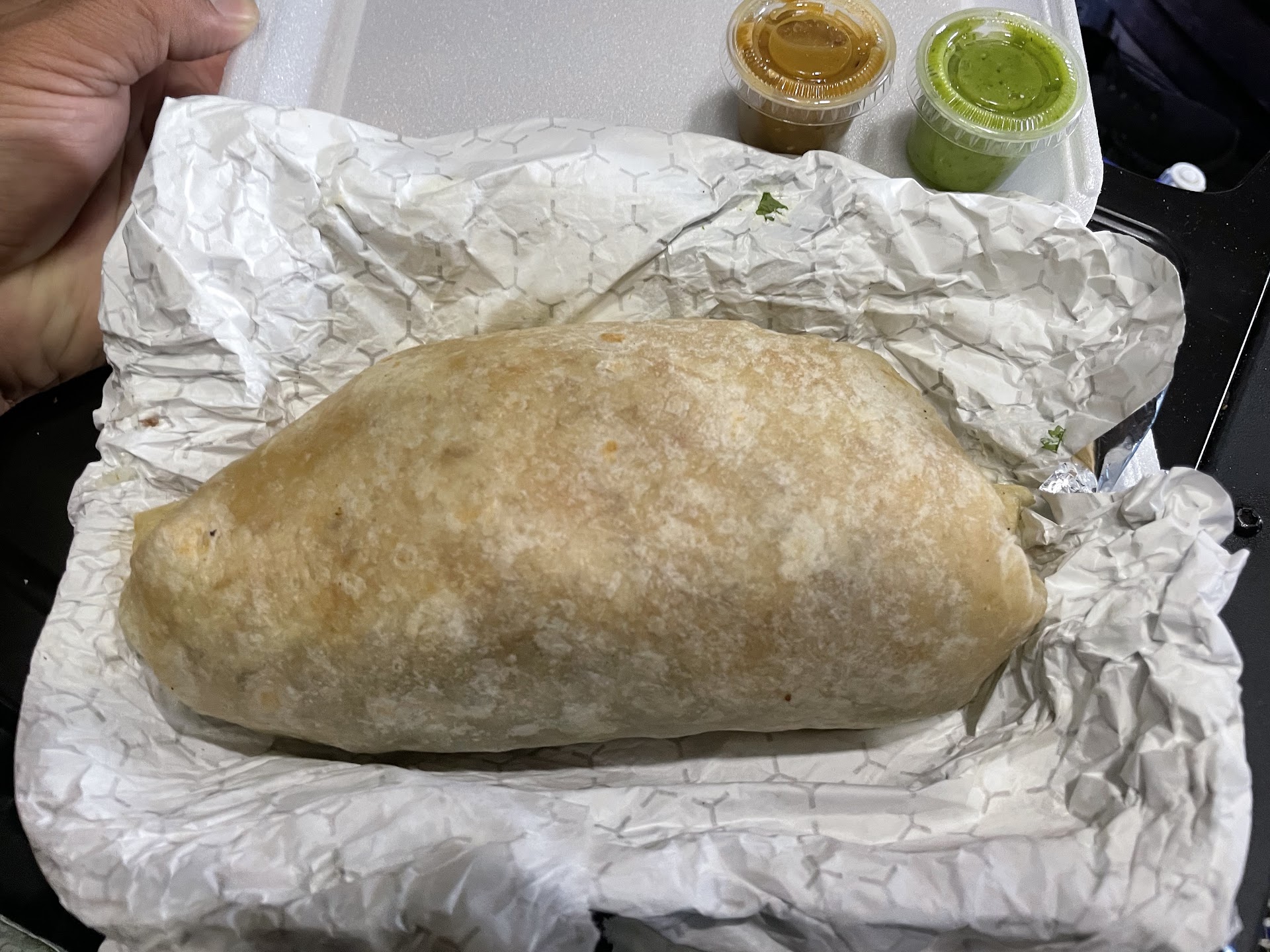I had this meal to go. It was well wrapped and then placed in a foam container. I was given salsas without having to ask for them along with napkins. I was offered more salsa but I didn’t need more.
