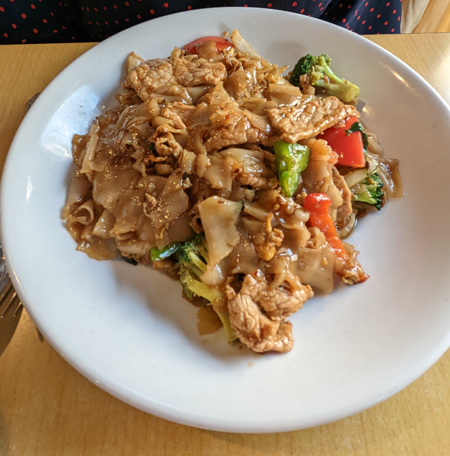 The Pad See Aew is a soy-based dish with flat noodles and your choice of beef, chicken, and pork, along with Chinese broccoli and egg. The dish was delicious and VERY filling! The Drunken Noodle dish included flat noodle with your choice of chicken, pork, beef. The plate also included broccoli, onion, tomato, bell pepper, egg, chili, basil leaves. The meal was ordered with medium spice, which had enough heat to make it enjoyable. You can ramp up the heat if you so choose.