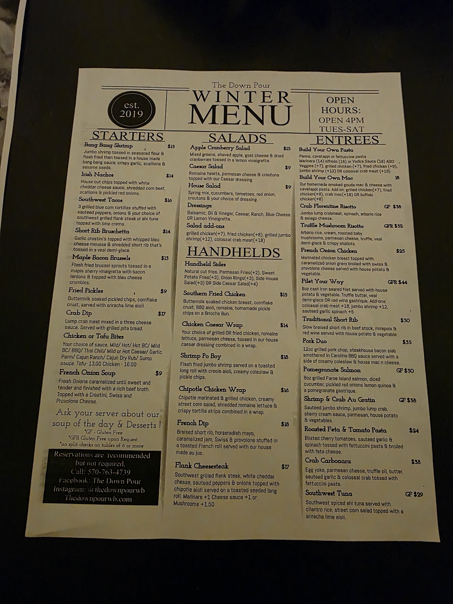 We follow down pour on facebook and no special menu or features were posted for today. We asked if we could order off of yesterdays and were shut down. She didn't even want to reach out to the back even though they were completely dead! We were the ONLY people sitting (by the umbrellas).