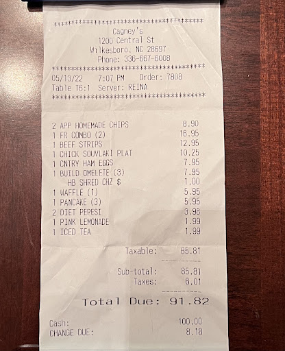 Read moreTonight after graduation the family and I decided to go to Cagney’s Kitchen in Wilkesboro. This was only my 2nd time at this Cagney’s location but we frequent the locations in and around Winston often with no issues. Tonight was a different story. I realize the cost on most everything has went up. I’m not naive to the fact that things have changed since Covid and I would not consider myself a greedy person. I ordered a 2 item combo with popcorn shrimp and white fish. The pic below shows the serving size. Now let’s be honest..90% of the time when you order this same thing at any other restaurant…the shrimp would be falling off the plate. You can easily make 2-3 meals from this usual order. That’s what I expected for $16.95. I honestly thought it may have just been a mistake so I kindly asked our server if this was the normal and she informed me that she would speak with her manager. The manager Arjan sent her back to inform me that because it was a combination plate they only give half servings. In my mind it should then be half the price. The shrimp were cold and had a weird aftertaste. The fish was decent. The squash was also cold and tasted like old grease. I asked that Arjan come speak with me and I began to explain my issues and asked that my meal be discounted. His response was “well that’s just how it is”. I said well then have it your way.. a bad review will be coming. He was extremely rude. Made several comments such as “what gives you the right to ask for a discount” and “I don’t care about your review”. He then proceeded to walk away. Sooo…here ya go Arjan Dede. For those of you that frequent this establishment I would think twice, but if you insist I would recommend requesting Reina as your server. She’s absolutely awesome. I just hate she has to work under such inconsiderate and...