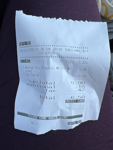 Read more10/10. I got coffee at the Elkin Talia’s as I was passing through and my coffee wasn’t made right (no hate to the lady at the Elkin Talia’s, I believe she was new and my order was complicated- it was the first time I’ve never had an issue) but I was already on my way back to Wilkes before I realized. I stopped by the Wilkes talia off 421 (I’m a die hard Talia fan lol) and I just mentioned to the lady at the window why I was there (because my first coffee was bad and I was craving it lol) and she jumped into action apologizing and even remade my coffee for me at no charge. She definitely didn’t have to do that as it was a totally different location but she really took charge and fixed it. My coffee was AMAZING and it made my night. I don’t remember her name but she was wonderful. It was Sunday night around 4pm (for record) and she def deserves a shout out for customer service and her coffee making skills cause it...