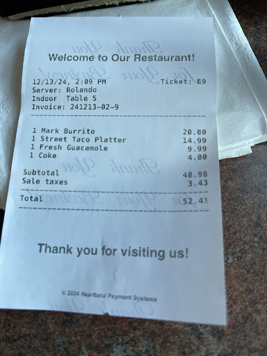 Read moreThe staff was nice enough and the place itself was clean and nice. They bring out salsa and tortillas which I love but found their salsa to be bland. I ordered a number 11 which was a beef taco, beef burrito and beef enchilada. The only thing correct that was on my dinner plate was the beef taco. The other two items were nothing more than flour tortillas with ground beef thrown into them topped with something that tasted like barbeque sauce, GROSS. I ate the taco which was mediocre at best and left the rest of the mess for the waiter to take away. Anyone could clearly tell by what was left on the plate that I was not happy with my meal at all. The waiter just took the plate and didn't even bother to ask how the meal was. I wasn't going to squabble over a $10 meal. We were given the check and upon reviewing it, I saw that my #11 meal was marked at a #5 meal. My husband ordered the steak burrito which he really enjoyed so there was that. I don't think I will give this place a second chance. Everyone's taste is different so my suggestion is to make sure the waiter/waitress confirms your order and when you get your meal, make sure it is exactly what...