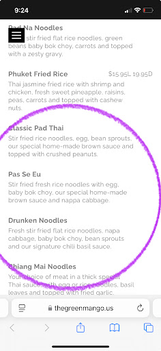 Ā Ā Ā Read moreTwo things to know upfront before you visit: when I went, they were doing takeout only, and they were cash-preferred. They don't have much space (maybe 6 tables in the entire place), and it is not the kind of place you'd go if you're looking for atmosphere (check out Nicki's Thai if that is what you want). Food was prepared quickly, with only a 4-7 minute wait. Prices here were more like what I am used to (unlike the other area Thai restaurants I've visited), but it shows in the quality. The phad thai was not up to snuff, lacking the distinctive balance of sweet, sour, and savory flavors. It was not offensive, just more bland than anything. To our cashier's credit, he tried to steer us away from the phad thai when asked for recommendations, encouraging us to try the drunken noodles if we were down for something spicy. That said, in my opinion, any Thai restaurant worth its salt needs to have a solid phad thai. Would I consider trying The Green Mango again? Maybe once, just to make sure I didn't just get a mediocre dish. Would I argue there is significantly better Thai food to be found in the...
