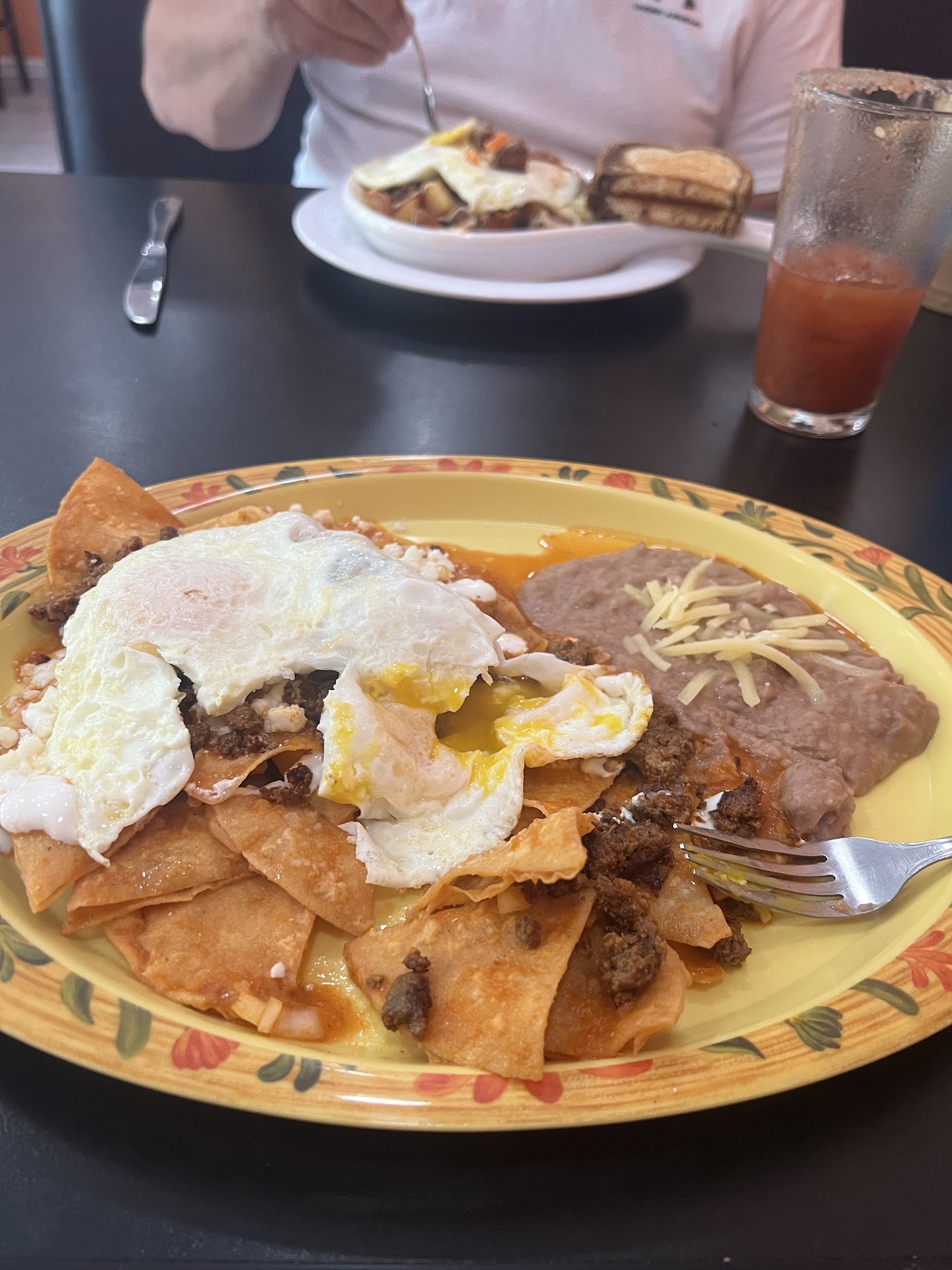 Day THREE!! Their Bloody Mary’s are perfectly spicy!! Repeated the Mexican Skillet, but our server suggested adding chorizo to my Chilaquiles!! Phenomenal!! Tortillas on the side!!
