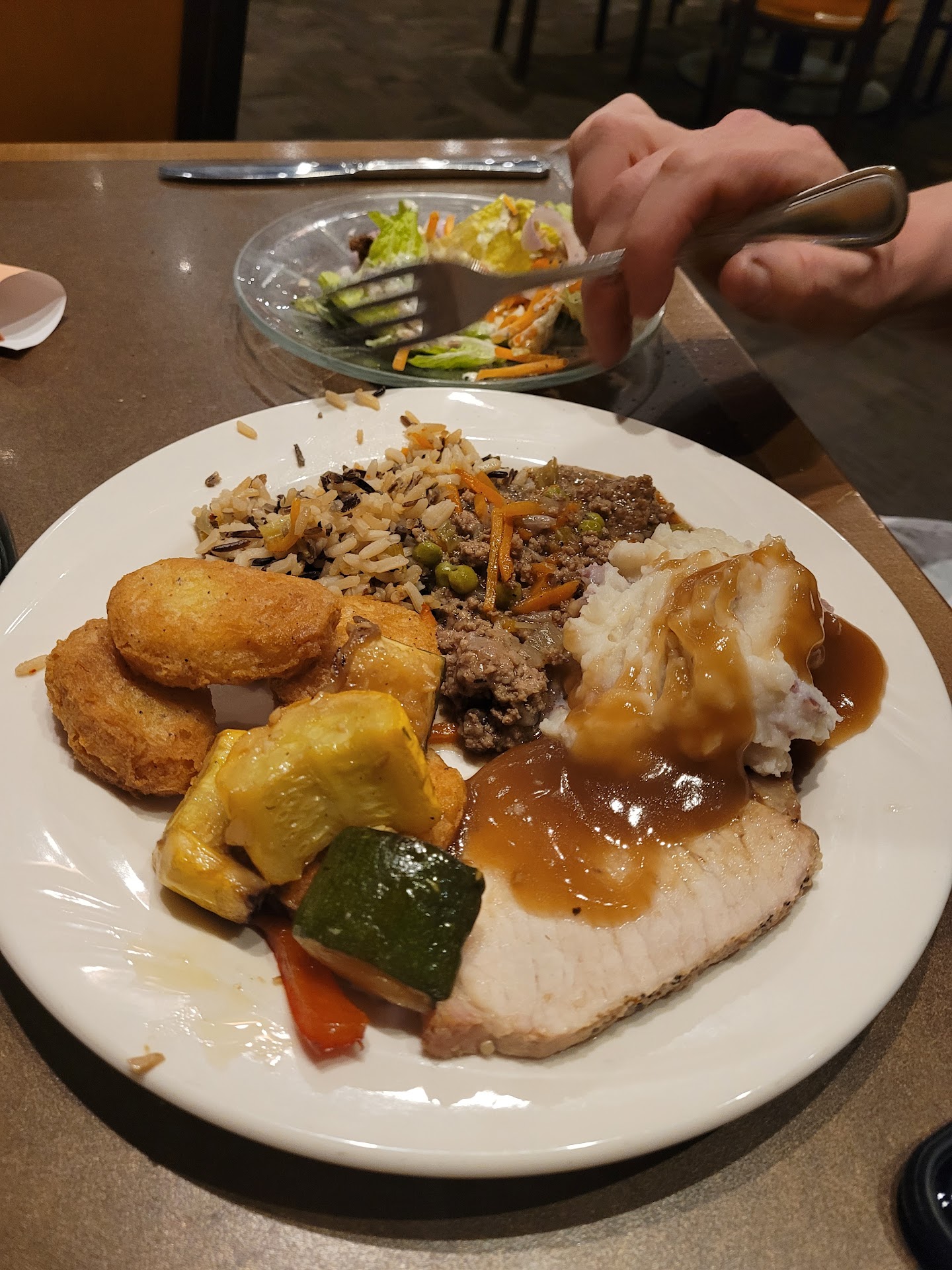 For us, it began as a dinner buffet. I chose pork loin to start. Decided it was tasty, and went back for seconds. They ran out and never refilled it. We're not talking about near closing, but at 7 PM!