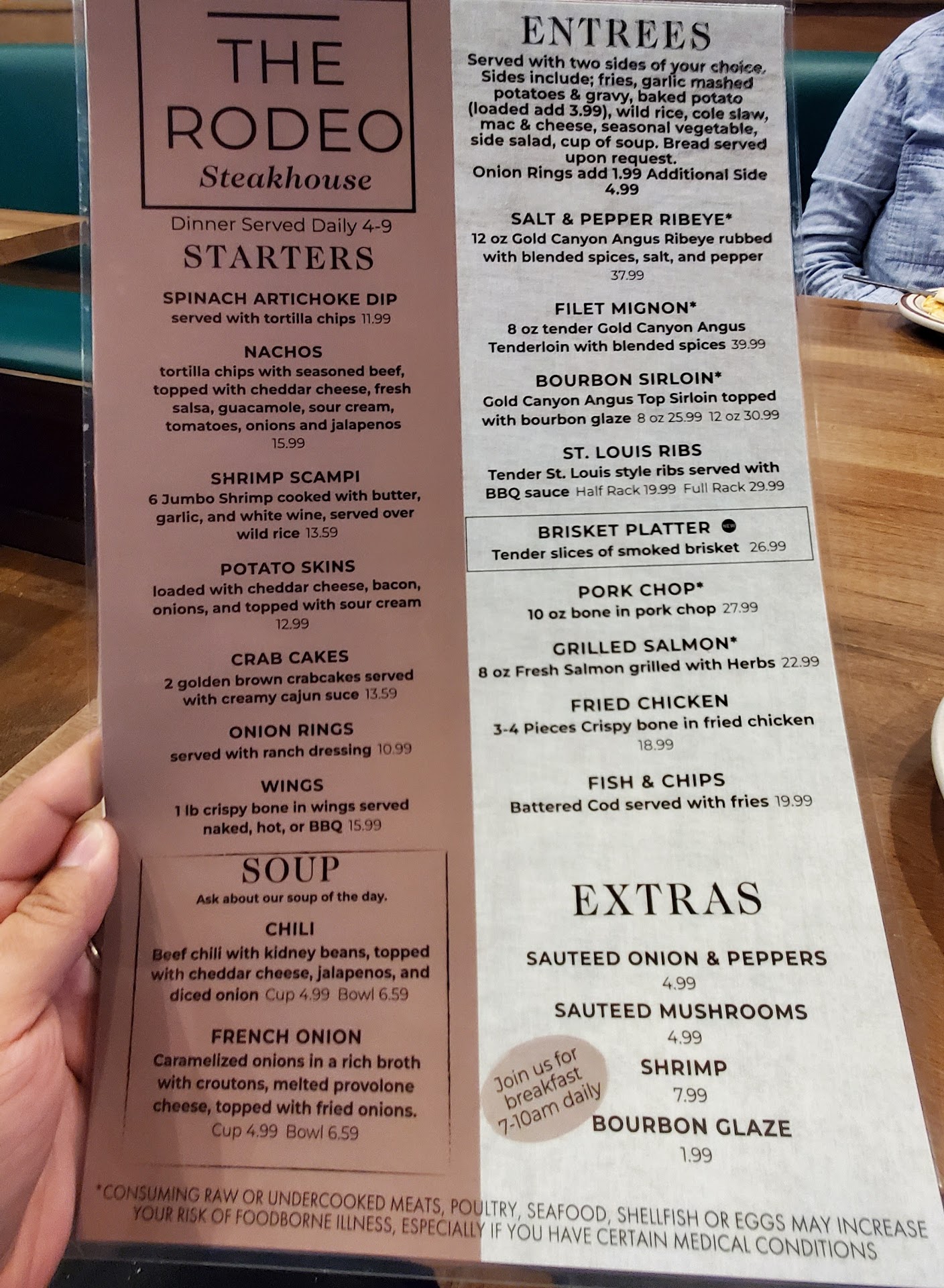 Atmosphere: while waiting, I had plenty of time to look around the big military flags on display in the dining room and they were more noticeable than any "rodeo" touches they put up.