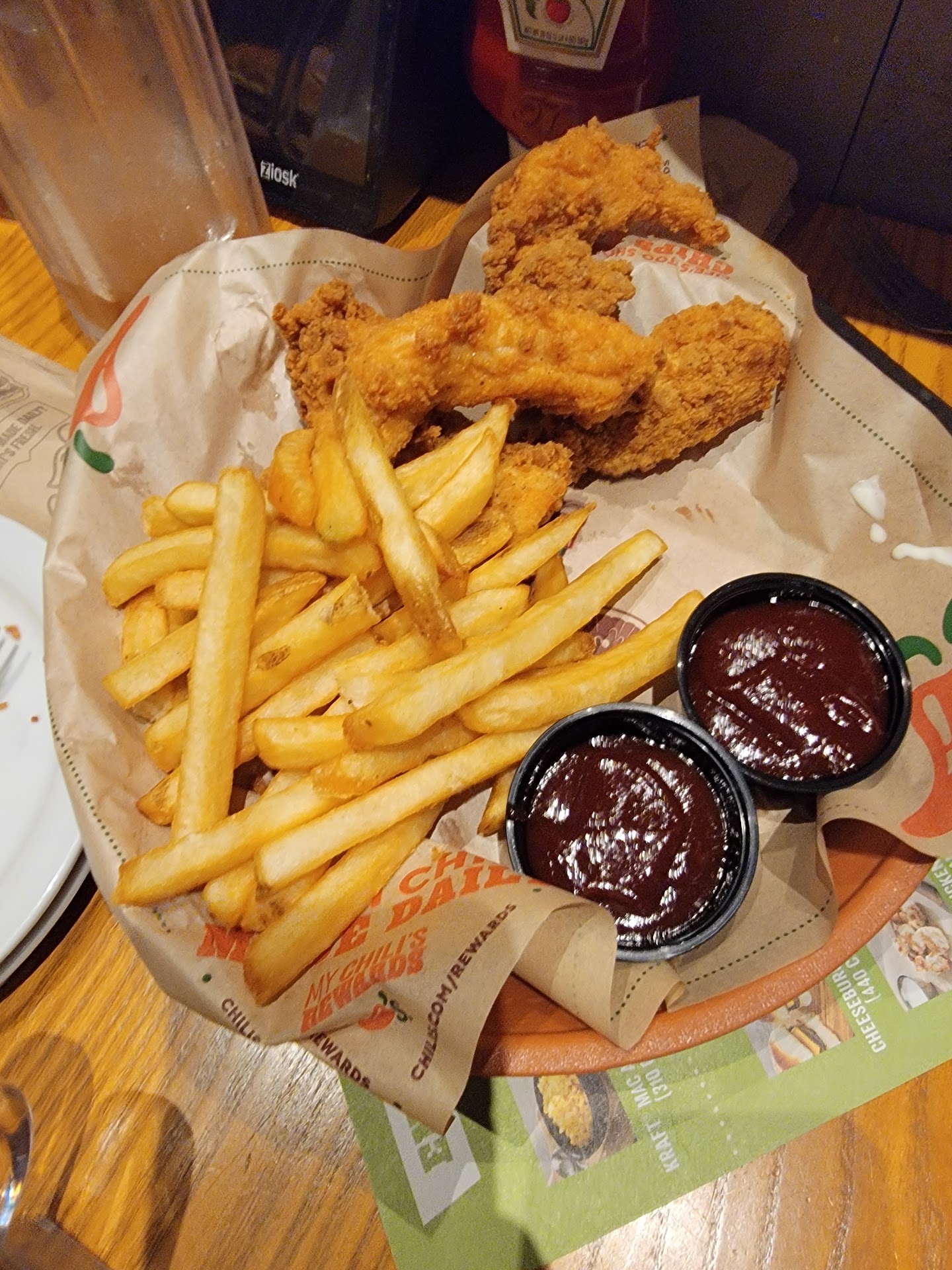 Original Review: Standard Chili's flavorful, salty, reheated frozen food. The service here was awful. There was no wait to be seated, but that was the only thing that had no wait. We ordered our drinks, an appetizer, and our entrees. It all showed up at the same time, and took much longer than we expected. My wife's sizzling fajitas came out with no sizzle whatsoever, clearly while we were waiting at the table, our food was waiting under a heat lamp. We asked for plates for our appetizer, they never came. We asked for a side of ranch to go with the chicken appetizer, it never came. We asked for a single refill, wishing we had rationed our drink through the salty food, and waited... And waited... Tried ordering more drink from the table top kiosk, which didn't work. We begged for more of whatever the waitress could get to the fastest to drink, anything, tried melting our ice, it was awful. When we were first seated, there were two tables around us that needed to be bussed. You can bet we were eyeing the leftover glasses of water on them, and those tables were still filthy when we finally left. On the plus side, we were able to pay via kiosk so we didn't have to wait even longer for the wait staff. Bring a canteen if you come, and your own napkins and plates, and if you have a few hours to spare you will probably enjoy your...